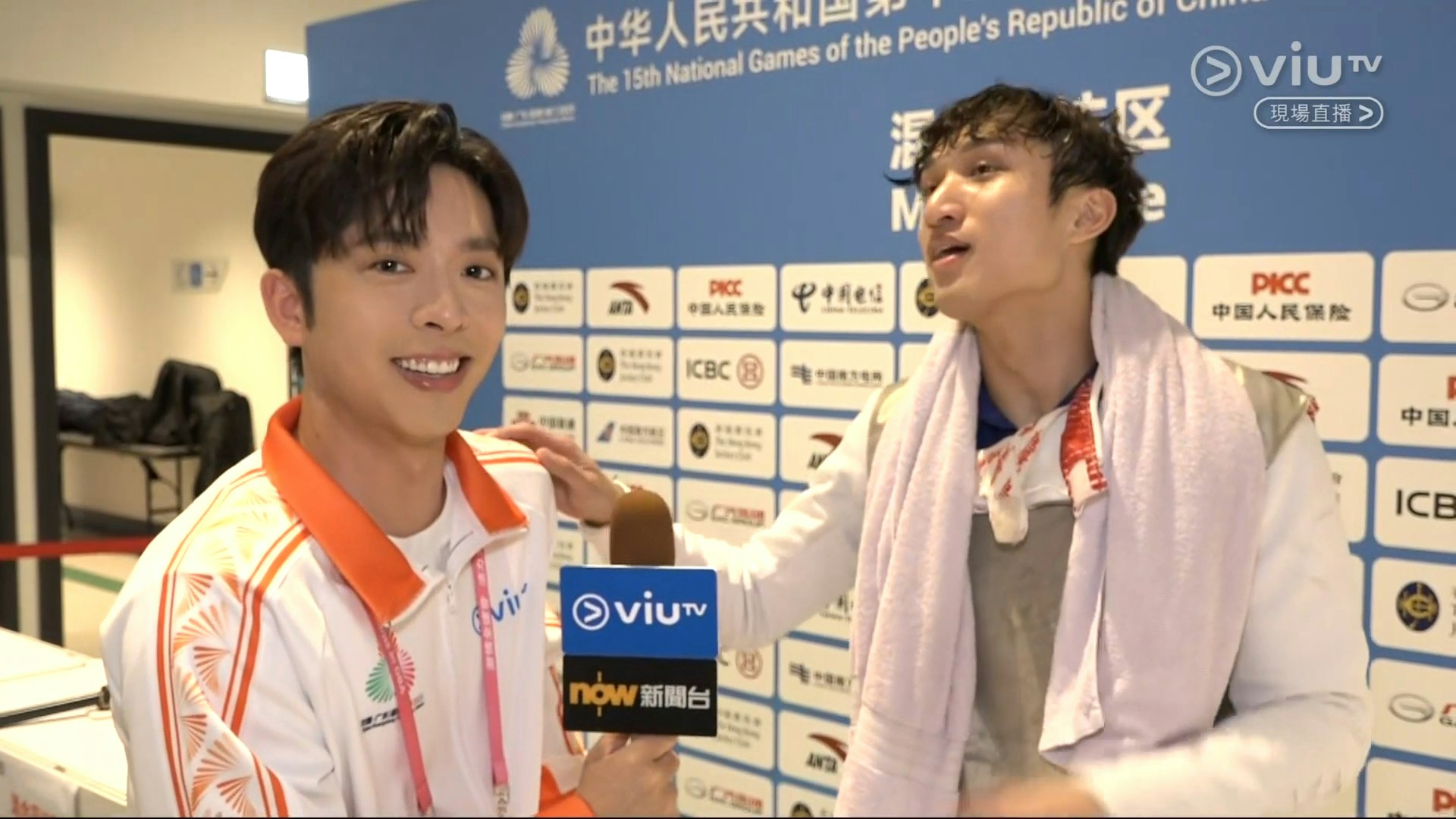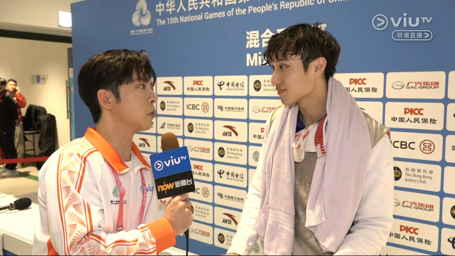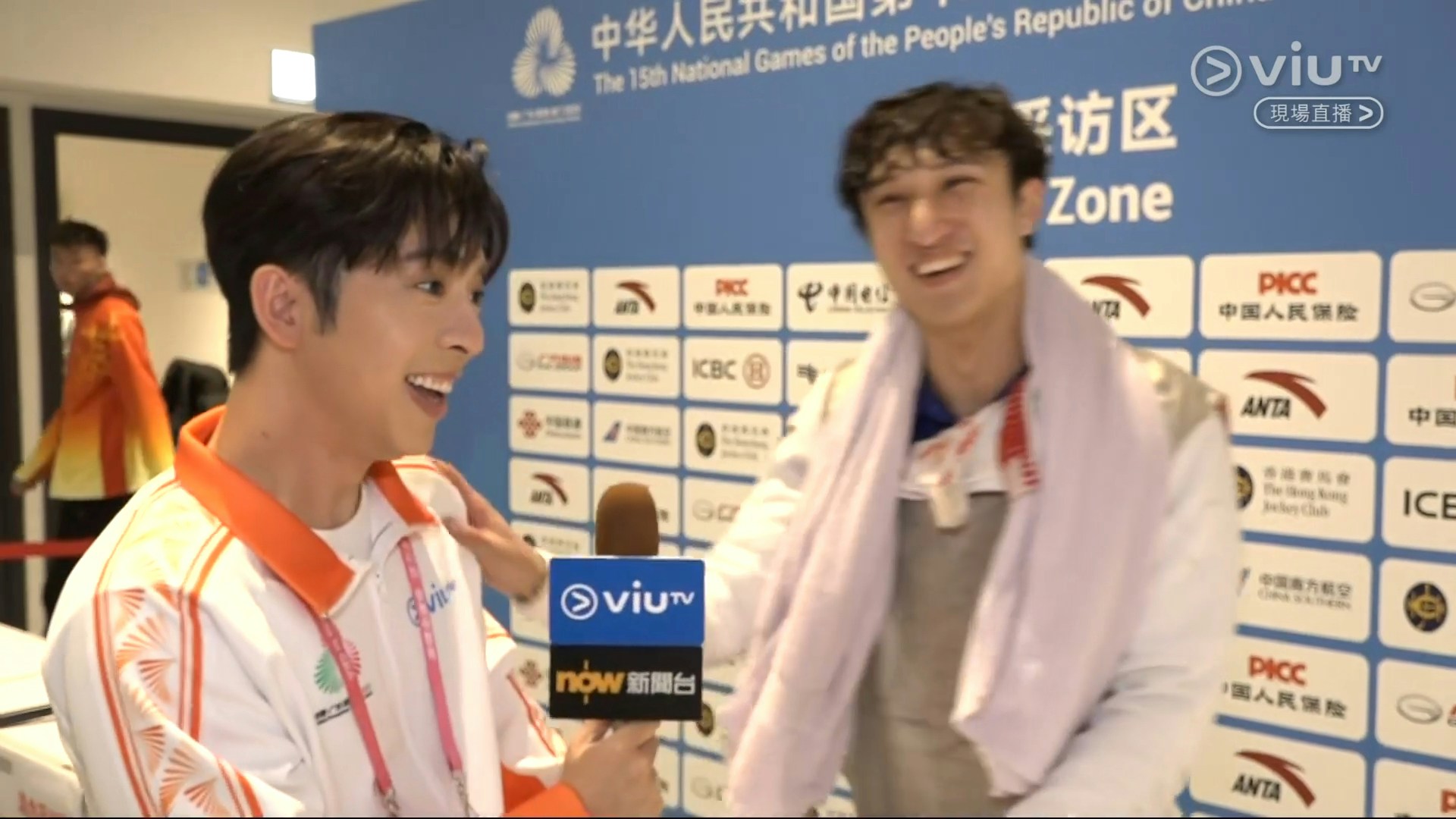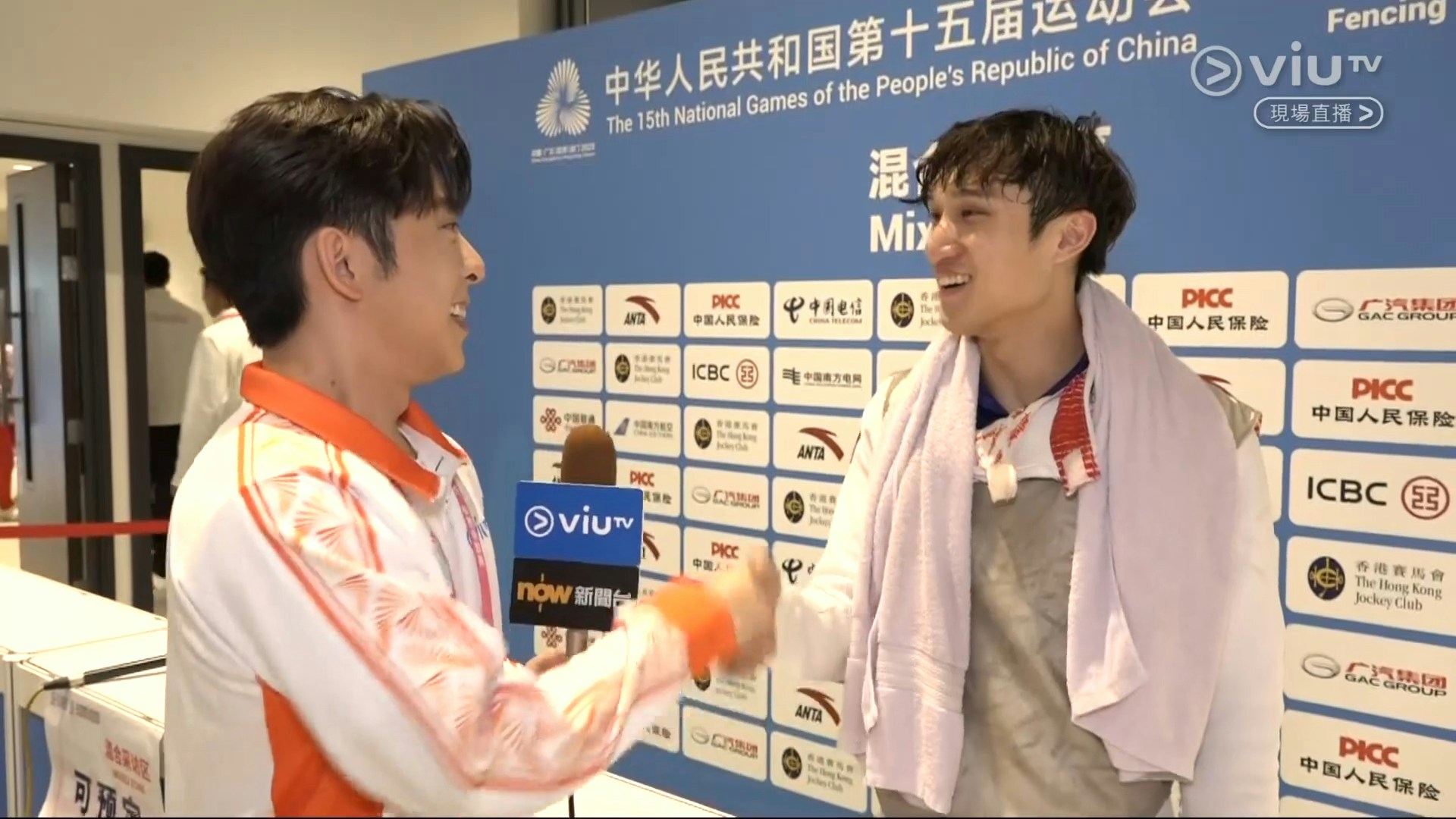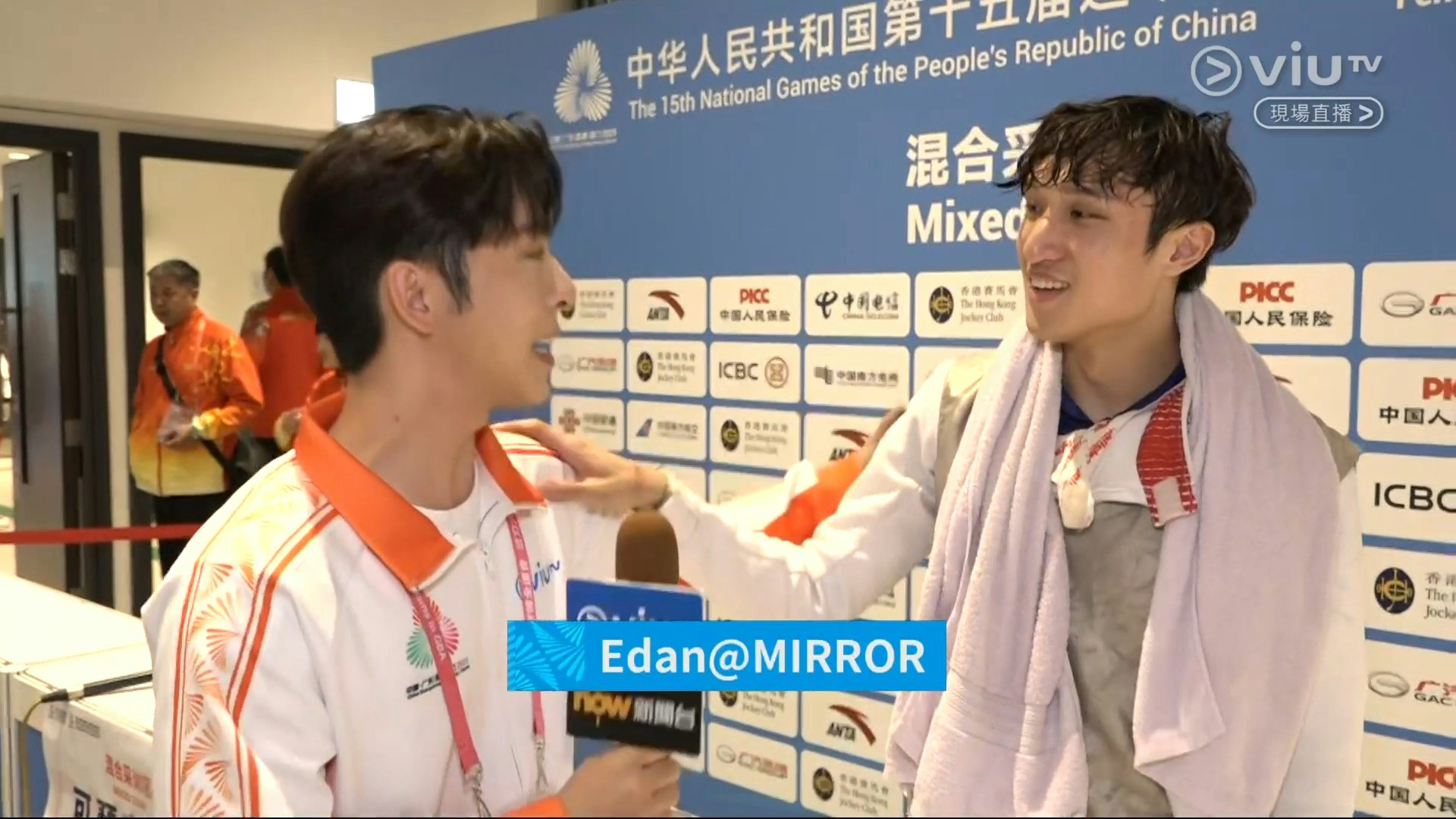 全運會男子花劍個人賽事今日(16日)在啟德體育園上演,港隊主將之一蔡俊彥於半總決賽對戰福建的許杰,輸9:15,八強下馬。今日ViuTV派出「特派體育記者」呂爵安(Edan)去訪問蔡俊彥,二人是大學時期室友,情同兄弟,一見面已立即互窒,相當搞笑。