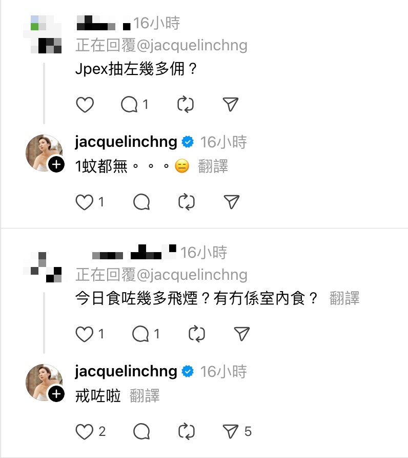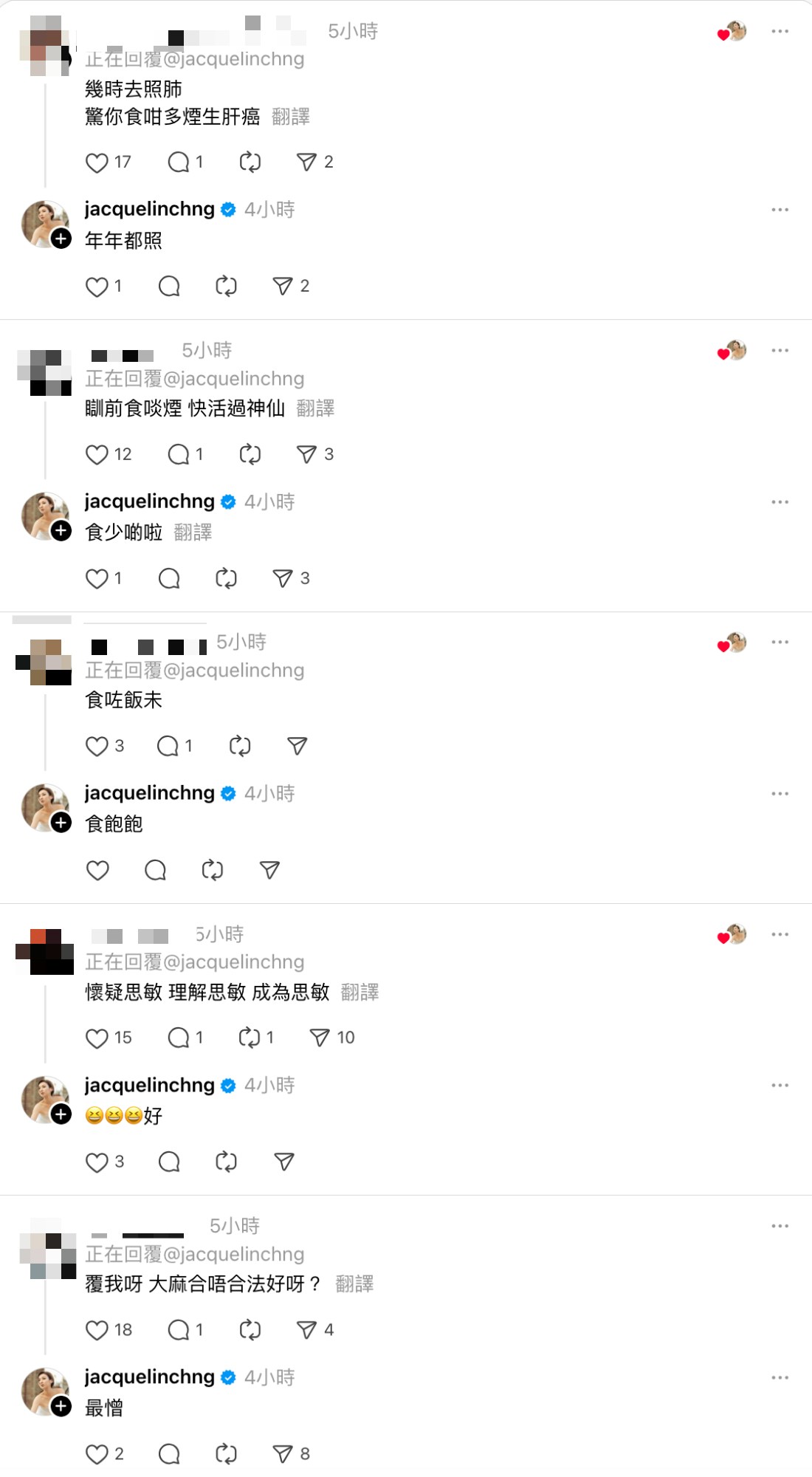 無論她出任何post,他們都會牽扯到室內吸煙一事,莊思敏統一回覆:「戒咗啦」又指自己最憎大麻。(Threads@jacquelinchng)