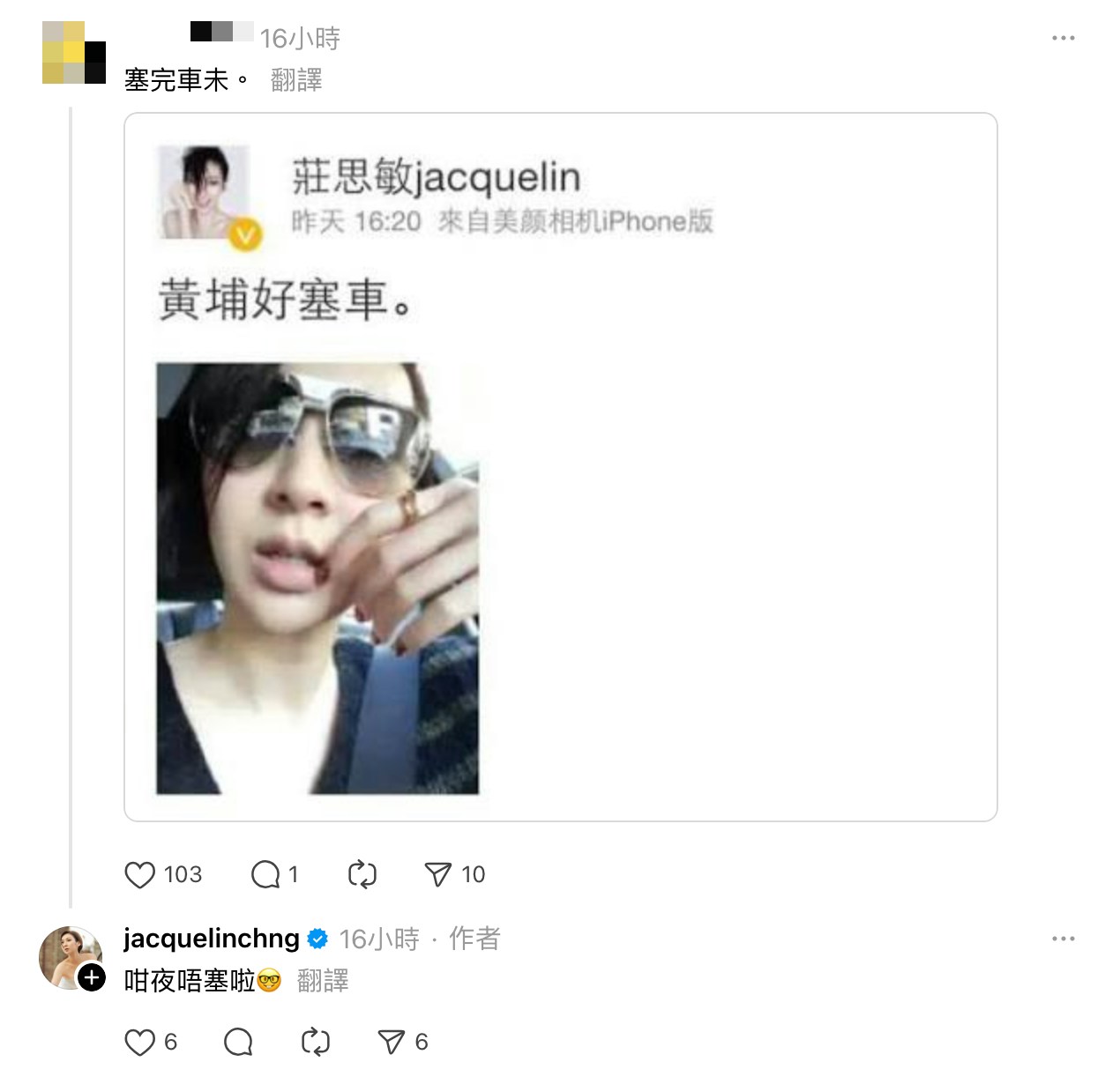當年莊思敏在車上車拍,並指:「黃埔好塞車。」不過網民從其太陽眼鏡倒影發現,前面的路根本暢通無阻,當年慘被恥笑,網民如今重貼此圖問她:「塞完車未?」她笑說:「咁夜唔塞啦」(Threads@jacquelinchng)