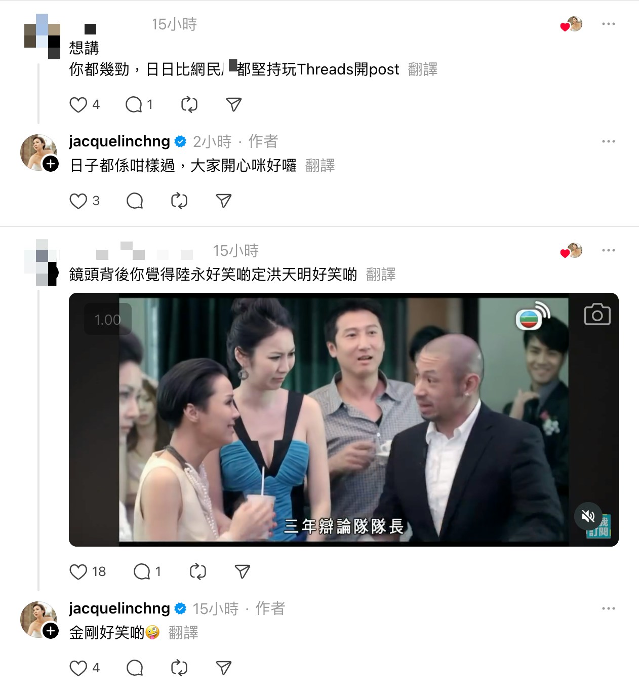 莊思敏近來很沉迷玩Threads,即使網民留言帶有敵意,她似乎愈鬧愈High!(Threads@jacquelinchng)