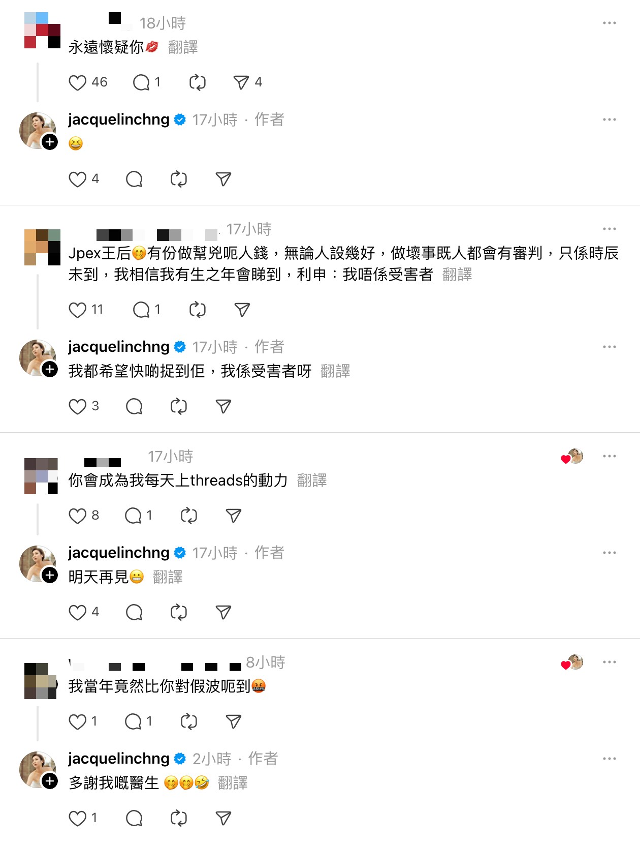 不論是捲進JPEX風波還是自爆隆胸,莊思敏都有覆。(Threads@jacquelinchng)