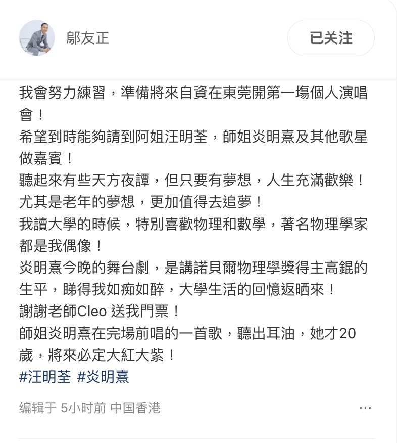 炎明熹過往性感造型。(IG@yiminghay) 鄔友正指自己發「歌星夢」,希望自資在東莞開第一場演唱會,想邀請到阿姐和炎明熹做嘉賓。鄔友正對炎明熹極為欣賞,原來兩人拜同一個老師學唱歌,鄔友正除了尊稱「師姐」炎明熹做「阿姐」之外,又激讚她的演出「聽出耳油」,將來必定大紅大紫,他發文:「師姐炎明熹在完場前唱的一首歌,聽出耳油,她才20歲,將來必定大紅大紫!」
