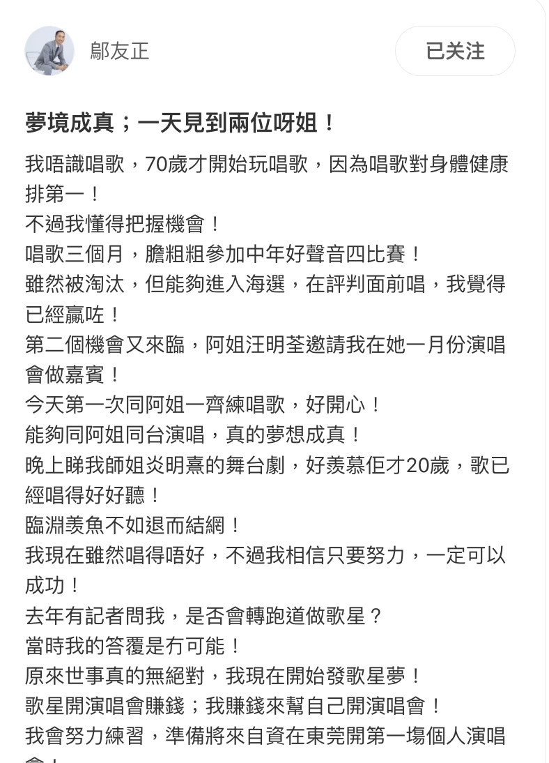 鄔友正獲邀做阿姐下年一月演唱會嘉賓。(小紅書)