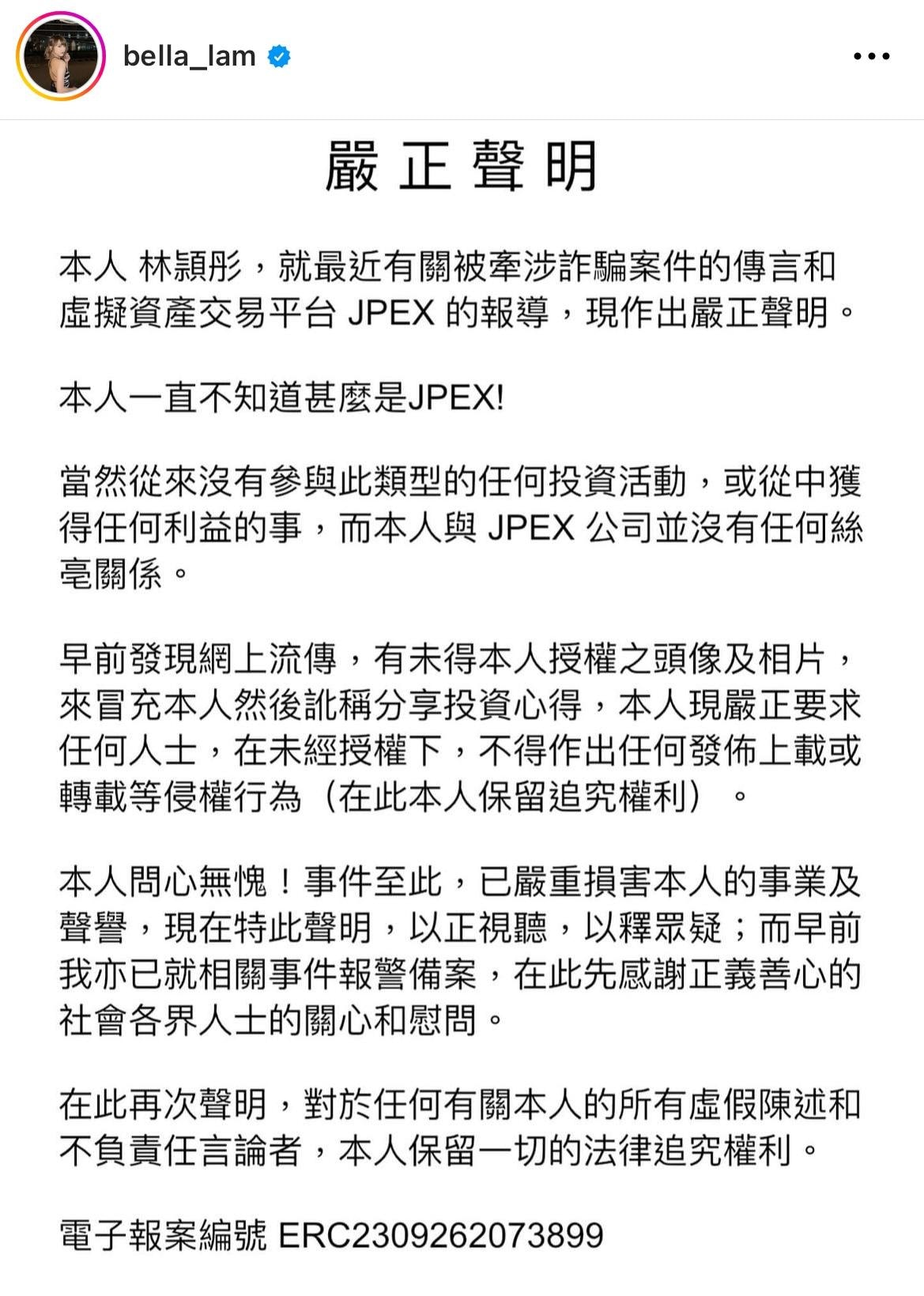 「本人林頴彤,就最近有關被牽涉詐騙案件的傳言和虛擬資產交易平台 JPEX 的報導,現作出嚴正聲明。