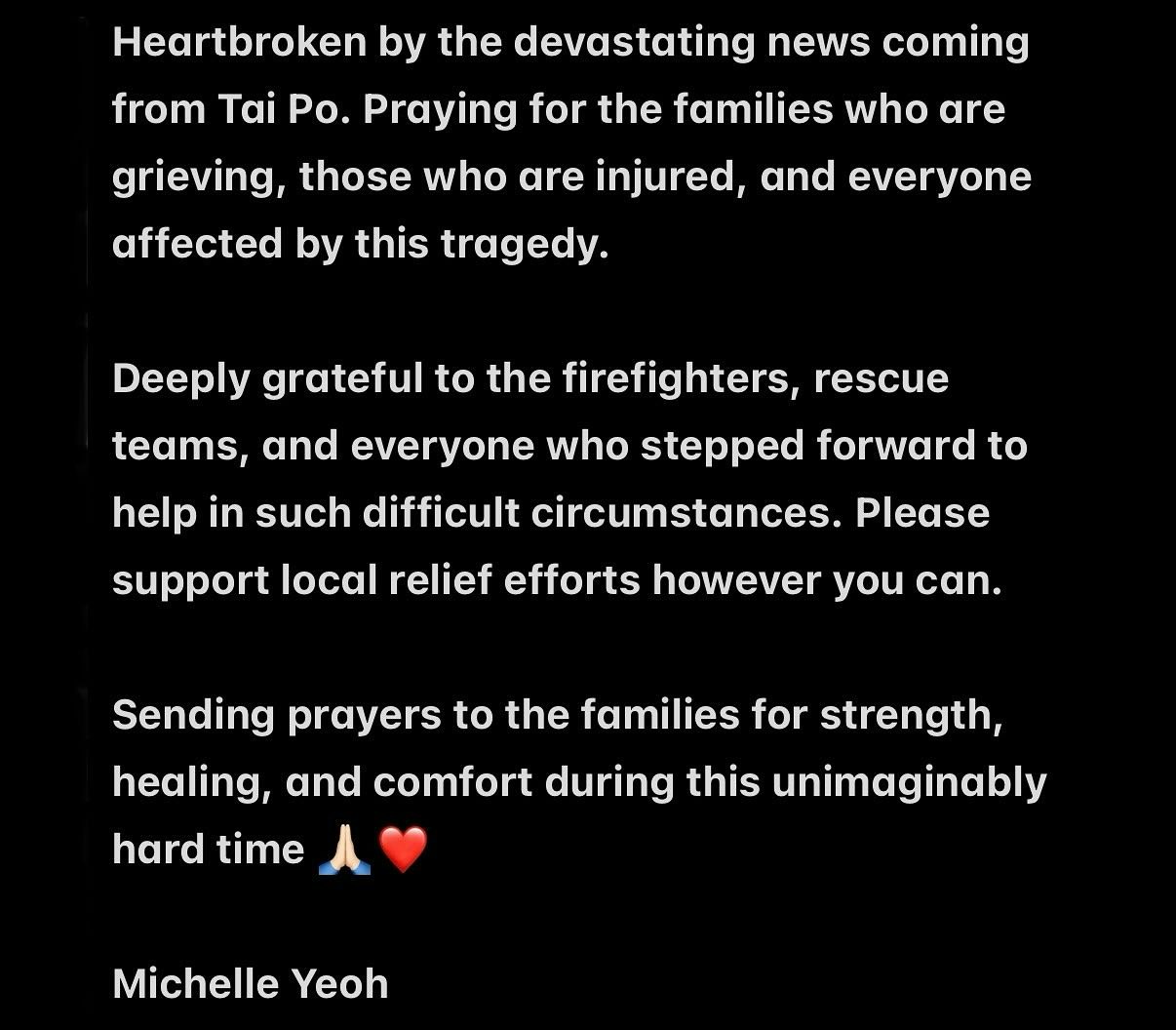 楊紫瓊以英文寫道:「聽到大埔傳來的噩耗,我心碎不已。我為悲痛的家屬、受傷的人們以及所有受這場悲劇影響的人們祈禱。衷心感謝消防員、救援隊以及所有在如此艱難的情況下挺身而出提供幫助的人們。請盡您所能支持當地的救援工作。為這些家庭祈禱,願他們在這段難以想像的艱難時期獲得力量、療癒和慰藉。」