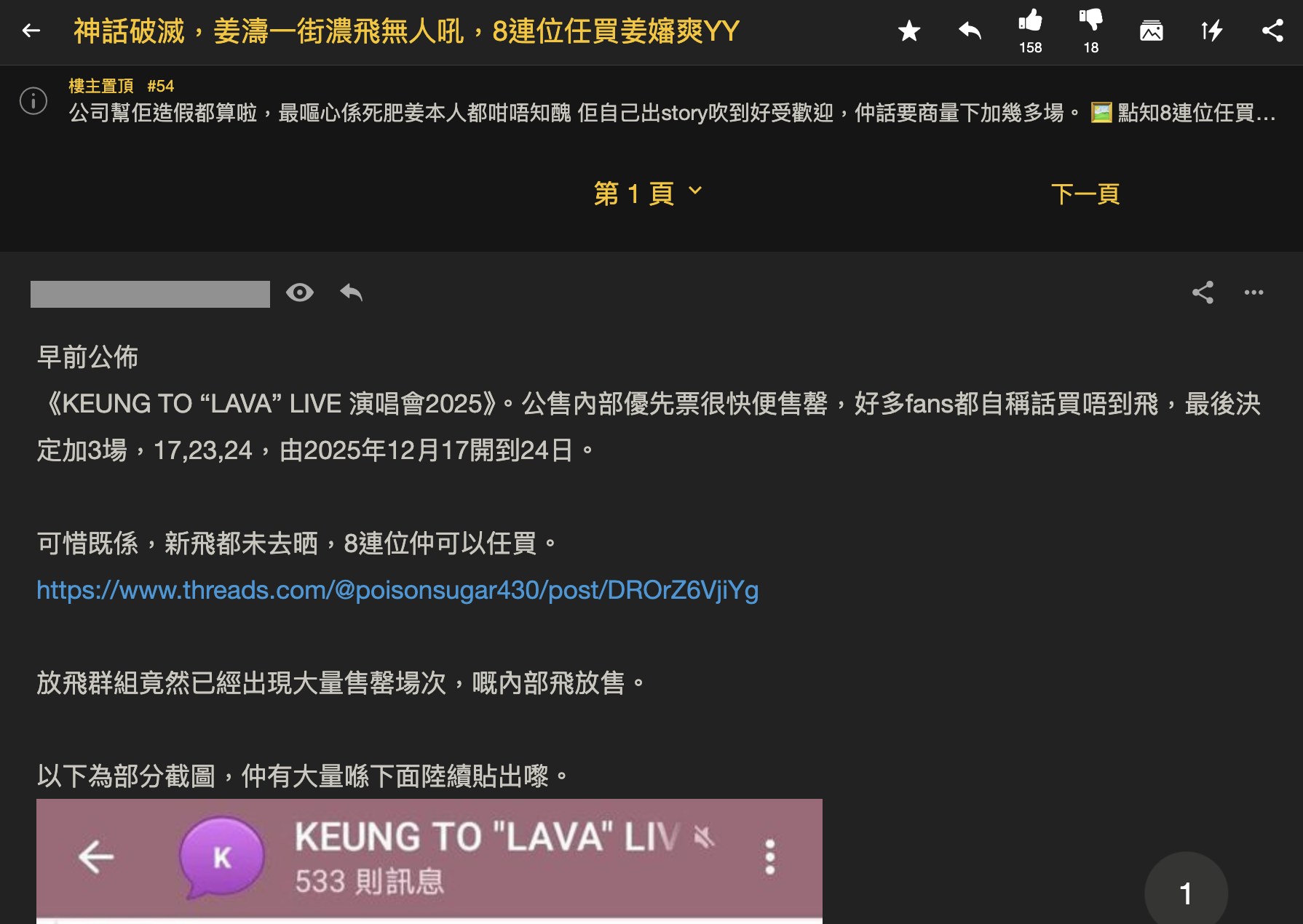 平心而論,每個演唱會都總有可能出現黃牛黨炒飛的情況,當中會出現熱門日子的門票被炒高,就一定會有所謂炒燶飛的情況,但可能只是粉絲之間割價出讓,或黃牛黨蝕少少放售。尤其是在熱門歌手的演唱會,加上場次較多,其實幾乎都會發生類似情況。實際是否真的如網民所說:「神話破滅,姜濤一街濃飛無人吼」,就真的要留待演唱會舉行當日觀察是否有很多「吉位」,才能夠定奪。