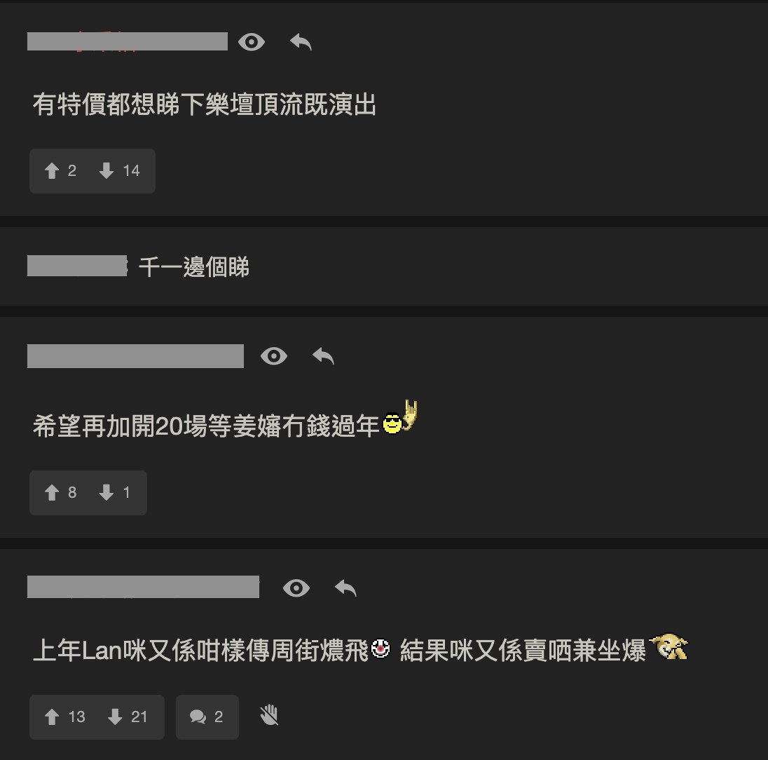 有關帖文引起網民熱烈討論,有網民認為,姜濤演唱會「炒燶飛」是意料中事,表示根本不可能有這麼多人睇,也有網民笑言可能一個粉絲睇幾次,所以才會放售部分場次。 當然,也有網民撐這些情況十分正常,因為總有人會因時間不合,或「買多咗」而賣飛,也有人引用11月才剛舉行的「Ian 陳卓賢@自由爵士音樂節2025」演唱會做例子,指當時傳出炒燶飛的情況,但同樣是座無虛席。