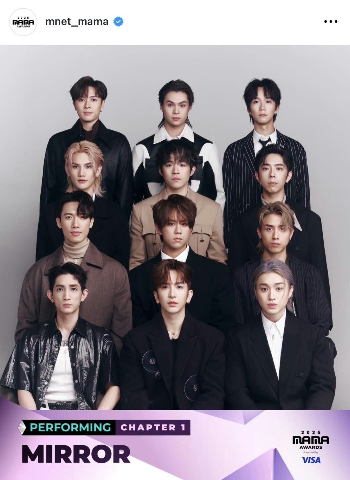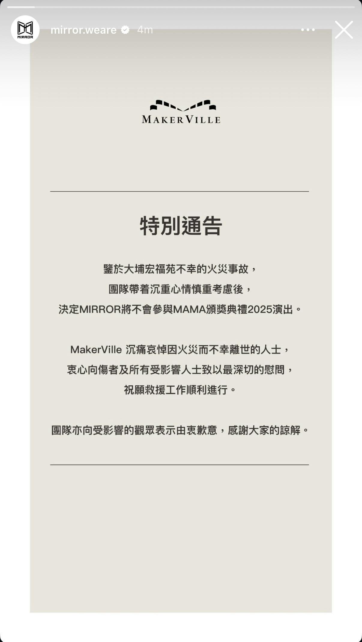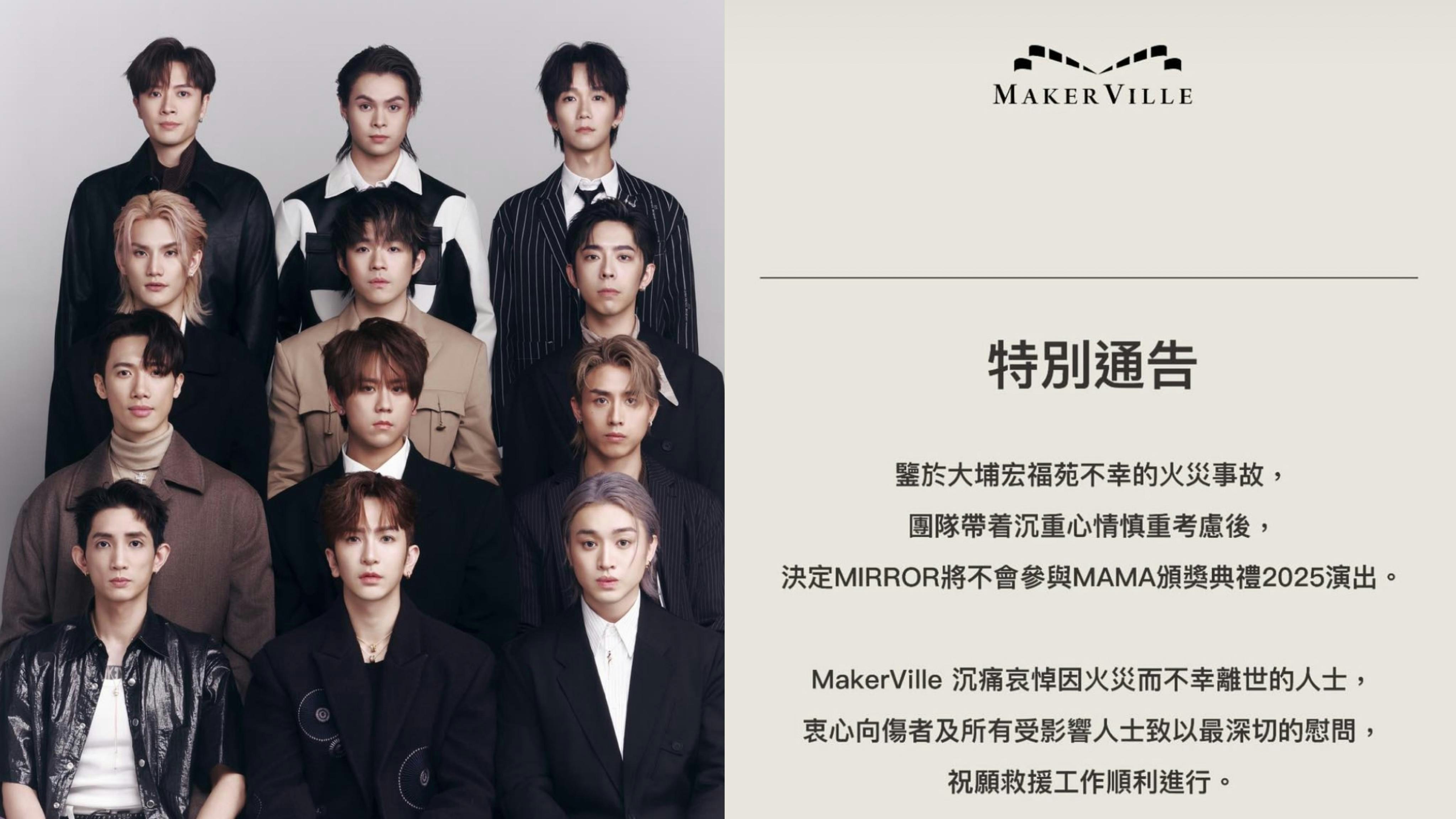 大埔宏福苑宏昌閣昨日(26日)發生五級火警意外,截至今日(27日)晚上11時,火警已造成至少75人死亡70人傷。火災令全城的市民都相當關注事態發展,全港多個娛樂活動相繼宣布延期或取消,而「2025 MAMA AWARDS」宣布將如期舉行,但將調整節目環節,並在聲明向所有受火災影響的人致以最深切慰問,除此之外,更將於活動上舉行默哀儀式及捐款支持受影響家庭。MIRROR原為MAMA表演單位之一。 因大埔宏福苑五級火,MIRROR將不會出席MAMA。而MIRROR是MAMA表演嘉賓之一,能登上國際舞台,令鏡粉事前倍感期待,MIRROR也加緊練習。不過,鑒於大火災情嚴重,團隊經慎重考慮後,在27日晚上宣布將缺席MAMA,並發聲明: Makerville的公告。