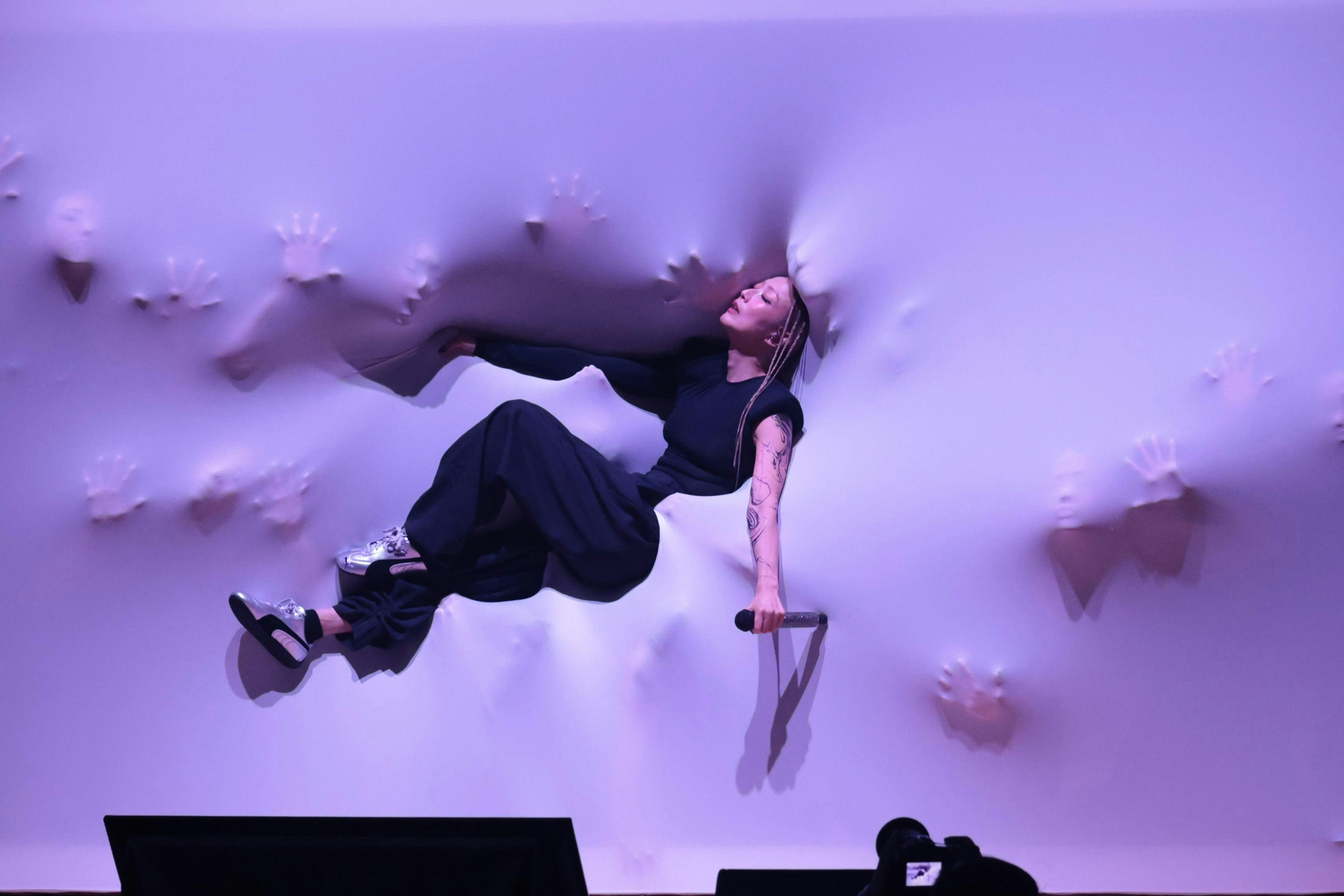 Sammi這一part《浮雕》舞台演出是排練了很久,她說看上去雖舒服,白色布幕後有很多人托起自己,但其實自己都要持續出力防止掉下,所以運動量需求很大,且根本不舒服。(陳順禎攝)