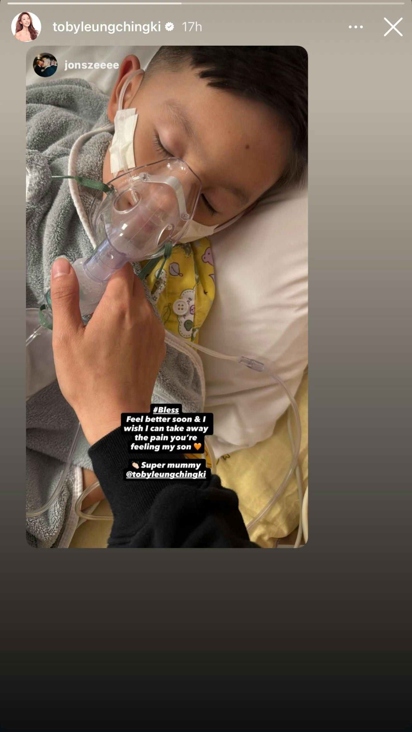 近日梁靖琪轉發了兒子入院照片。仔仔疲倦地瞓在病床上吸氧,蓋上毛氈雙眼緊閉,一副有氣無力的模樣,令父母大為心痛。施雋賢發文指很想帶走兒子的痛苦,「Feel better soon & I wish I can take away the pain you're feeling my son」。他又大讚梁靖琪是超級媽媽「Super mummy」,對妻子公開肯定。