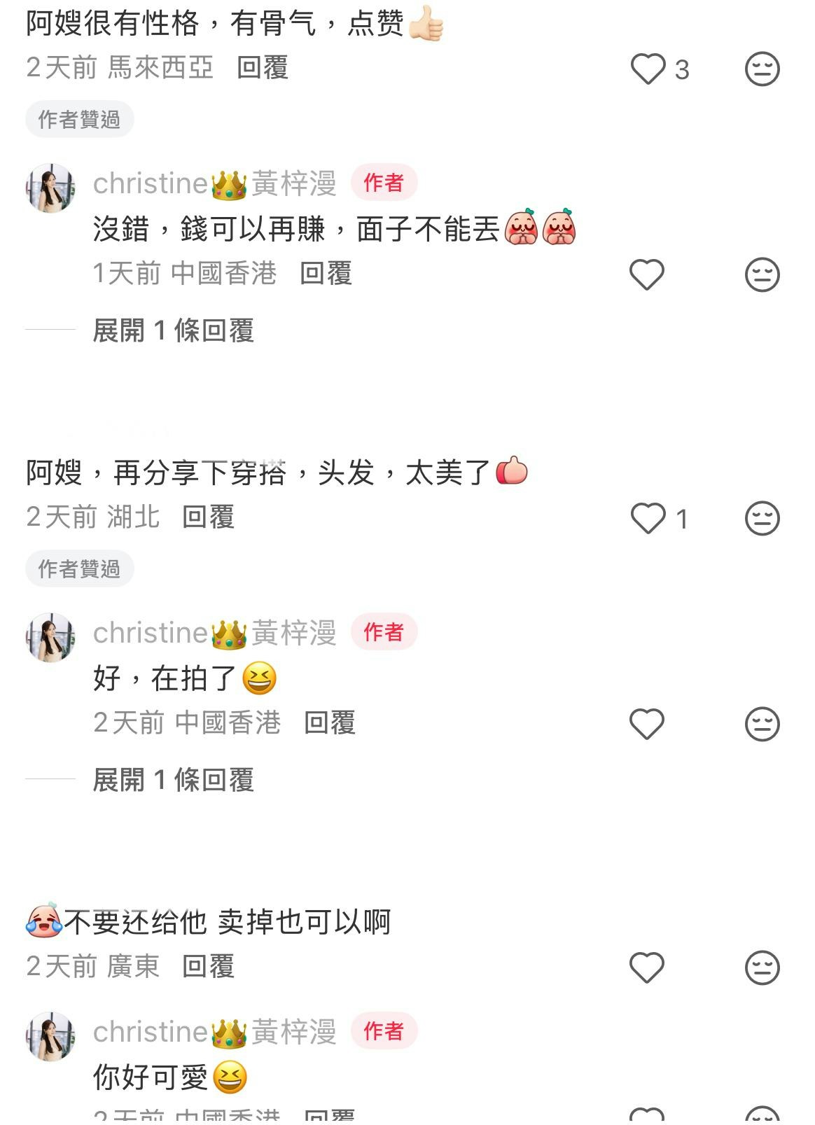 黃梓漫獲激讚有骨氣,黃梓漫回覆:「沒錯,錢可以再賺,面子不能丟」;又有人為黃梓漫感不值,「不要還給他 賣掉也可以啊」,黃梓漫僅回覆:「你好可愛」。