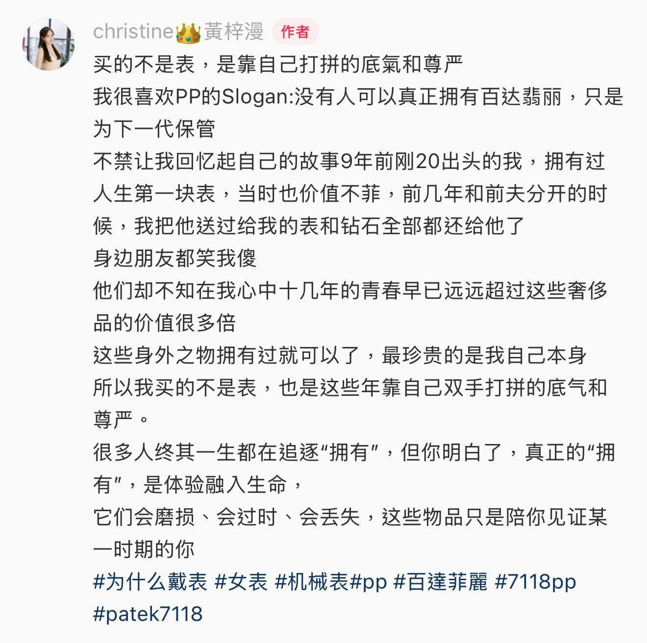 黃梓漫指雖然被朋友笑傻,但卻認為做得對,她說:「身邊朋友都笑我傻 他們卻不知在我心中十幾年的青春早已遠遠超過這些奢侈品的價值很多倍 這些身外之物擁有過就可以了,最珍貴的是我自己本身所以我買的不是表,也是這些年靠自己雙手打拼的底氣和尊嚴。 很多人終其一生都在追逐"擁有",但你明白了,真正的“擁有",是體驗融入生命, 它們會磨損、會過時、會丟失,這些物品只是陪你見證某一時期的你」。