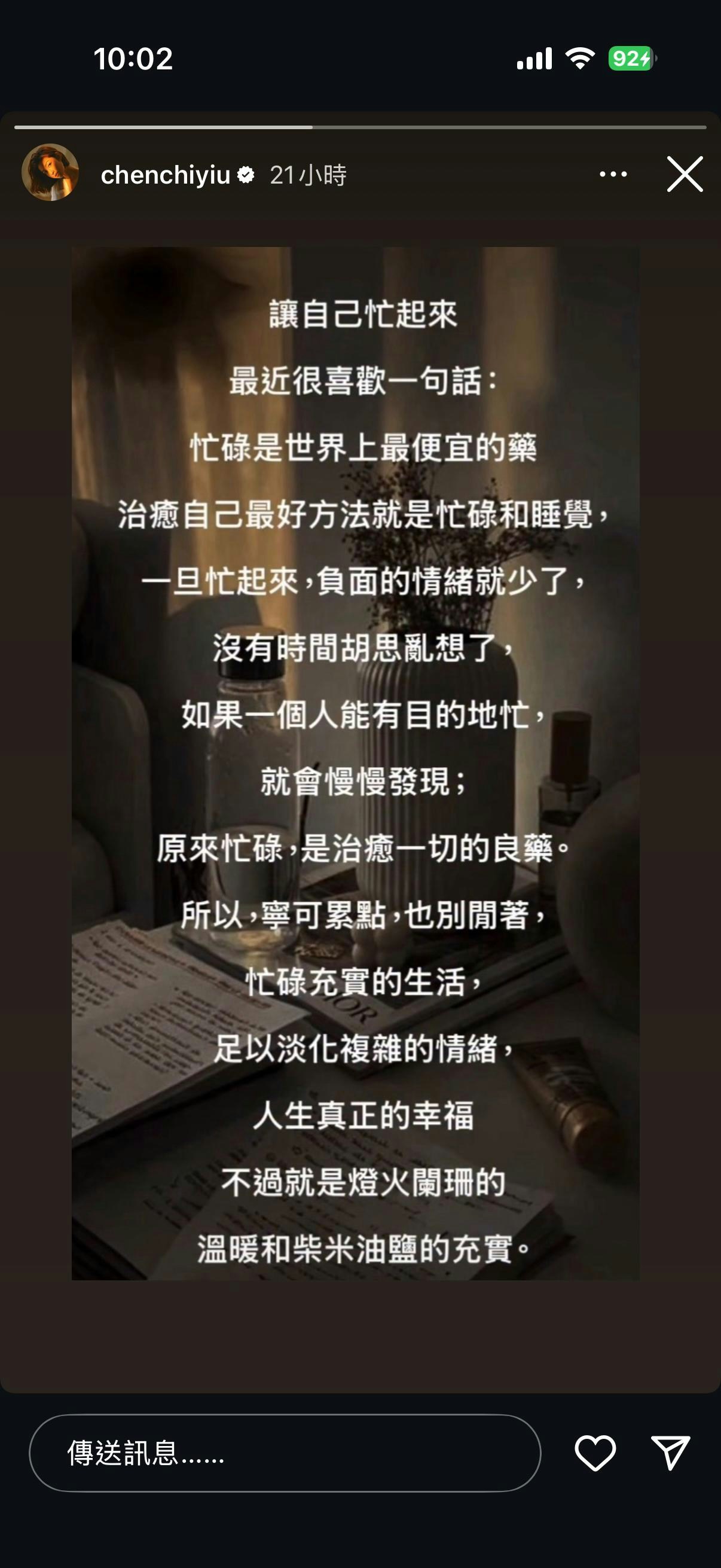 雖然工作忙碌,陳自瑤仍不時會於社交網分享她的生活點滴,更新近況。昨日她就於IG story貼出了一段文字,似是有感而發寫道:「讓自己忙起來 最近很喜歡一句話: 忙碌是世界上最便宜的藥 治癒自己最好方法就是忙碌和睡覺,一旦忙起來,負面的情緒就少了, 沒有時間胡思亂想了, 如果一個人能有目的地忙, 就會慢慢發現; 原來忙碌,是治癒一切的良藥。 所以,寧可累點,也別閒著, 忙碌充實的生活, 足以淡化複雜的情緒, 人生真正的幸福 不過就是燈火闌珊的 溫暖和柴米油鹽的充實。」流露出感性的一面,未知是否遇到什麼經歷令她突然深有感觸,難怪她這樣忙碌仍覺享受。