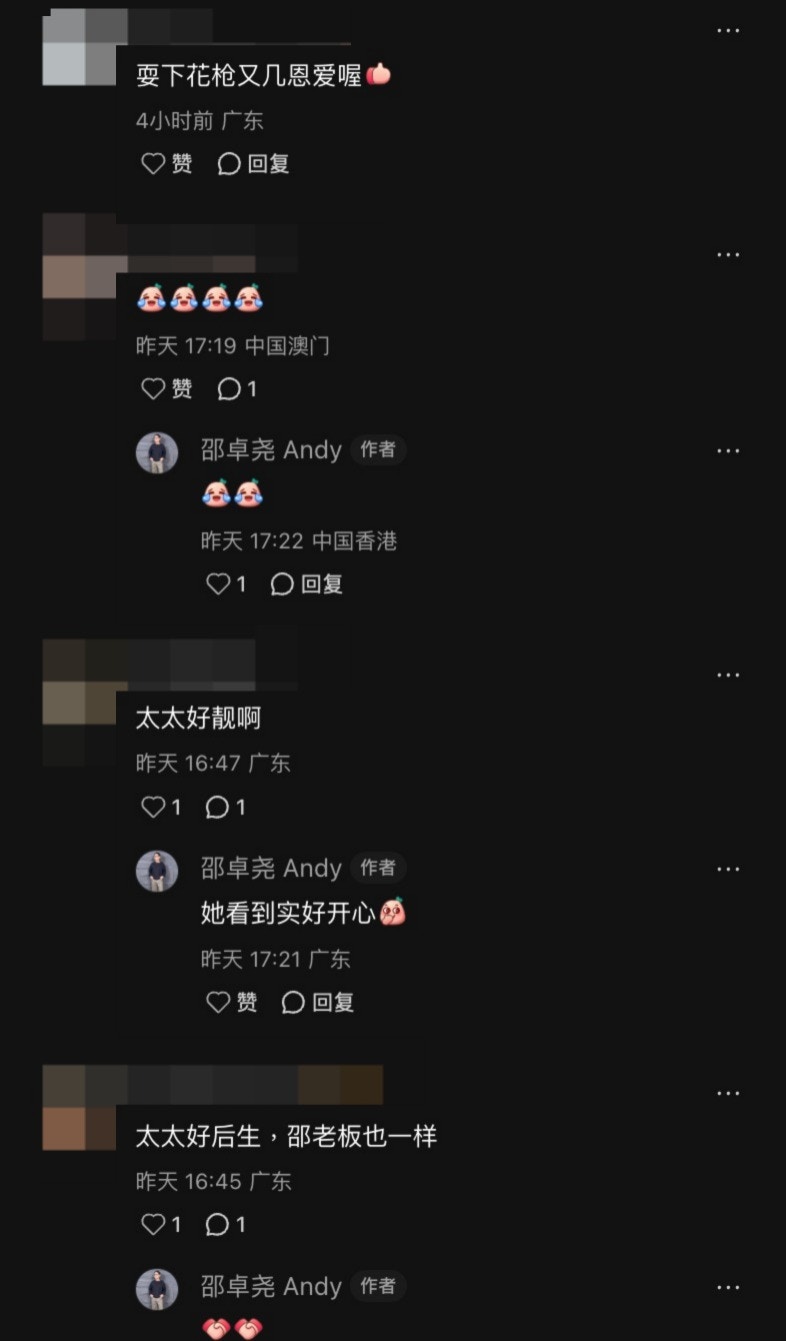 雖然影片中兩公婆「耍花槍」,但網民的焦點卻落在邵太身上。雖然邵太打扮樸素,但難掩賢淑氣質,身穿貼身上衣盡現豐滿身材,不少網民紛紛留言大讚:「阿嫂登場」、「哥,又秀恩愛了,阿嫂好靚女」、「太太好後生,邵老闆也一樣」、「太太好靚啊」。對於網民的讚美,邵卓堯亦大方回覆指太太知道後一定很開心。