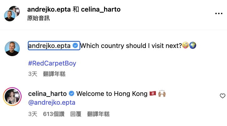 陳楨怡留言歡迎Andrew Wave來港。(IG@andrejko.epta)