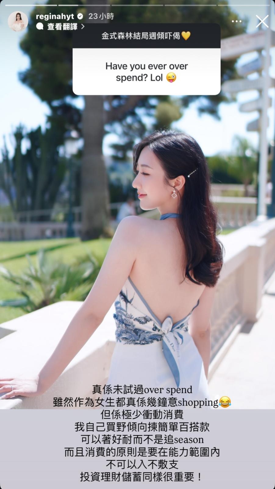 劇集《金式森林》進入結局周,有份參演的何依婷近日在網上與網民互動,其中有網民問到:「Have you ever over spend? (你有試過過度消費嗎?)」何依婷坦言:「真係未試過over spend。」她解釋,雖然作為女生都真的挺喜歡shopping,但她極少衝動消費,「我自己買野傾向揀簡單百搭款可以著好耐而不是追season。而且消費的原則是要在能力範圍內不可以入不敷支,投資理財儲蓄同樣很重要!」