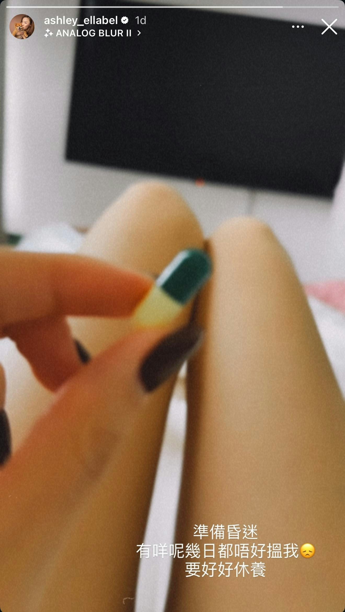 朱智賢日前在限時動態上載一張照片,朱智賢躺在床上,曬出美腿,她手持狀似藥物的膠囊,發文指之後幾日要好好休養,她說:「準備昏迷 有咩呢幾日都唔好搵我 要好好休養」。朱智賢又加上一個疲倦的Emoji,似乎身心疲累。