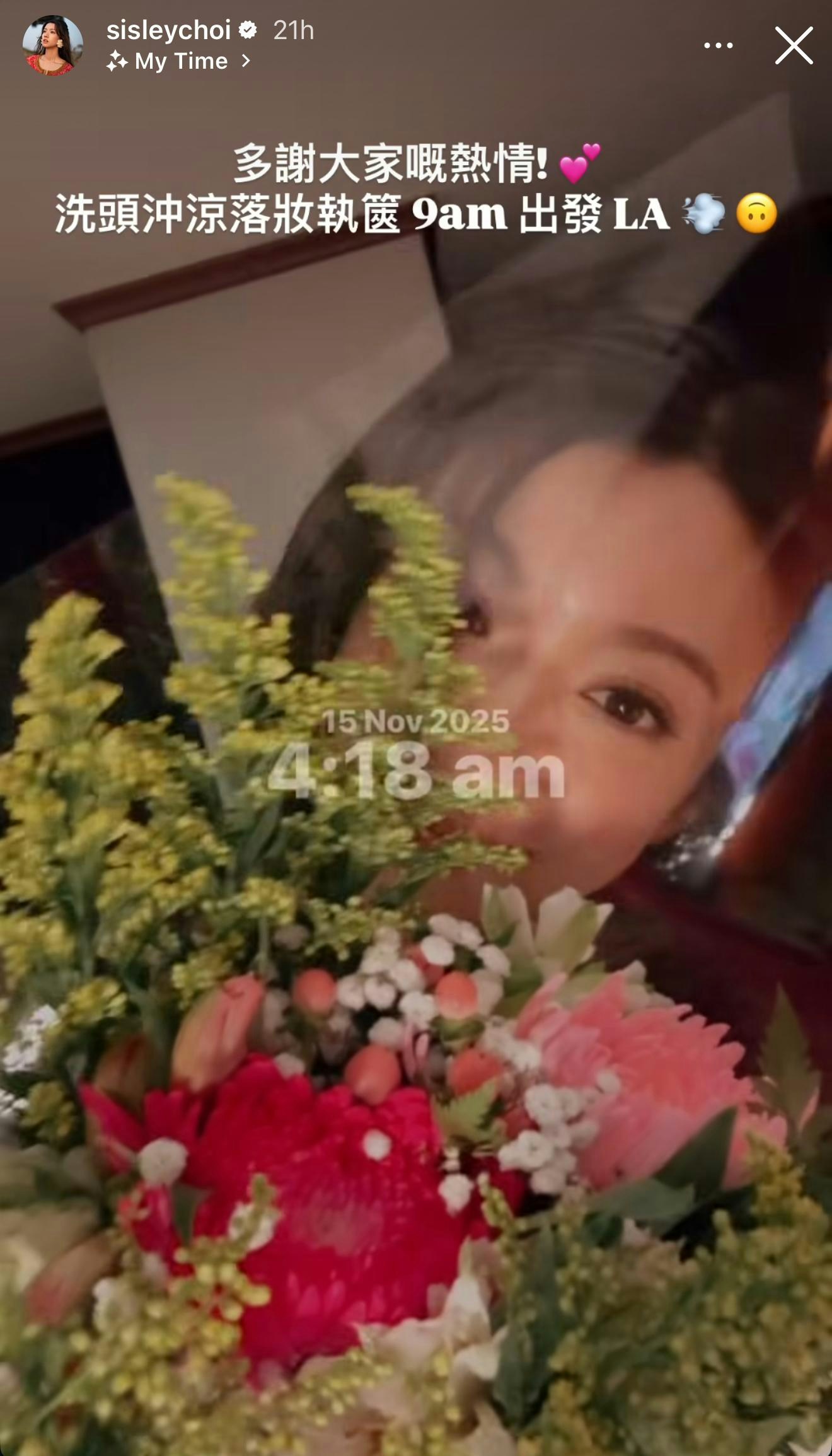 蔡思貝近日孖住羅子溢,還有兩位《中年好聲音》歌手羅啟豪和王鄭浚仁一齊去美國登台搵真銀。她飛到紐約和洛杉機登台,完成演出後,蔡思貝手抱一束花,感謝大家的熱情,她在限時動態發文道:「多謝大家嘅熱情!洗頭沖涼落妝執篋9am 出發LA」。其限時動態標註的是凌晨4時18分,蔡思貝為工作早早起身準備,十分重視每一次機會。