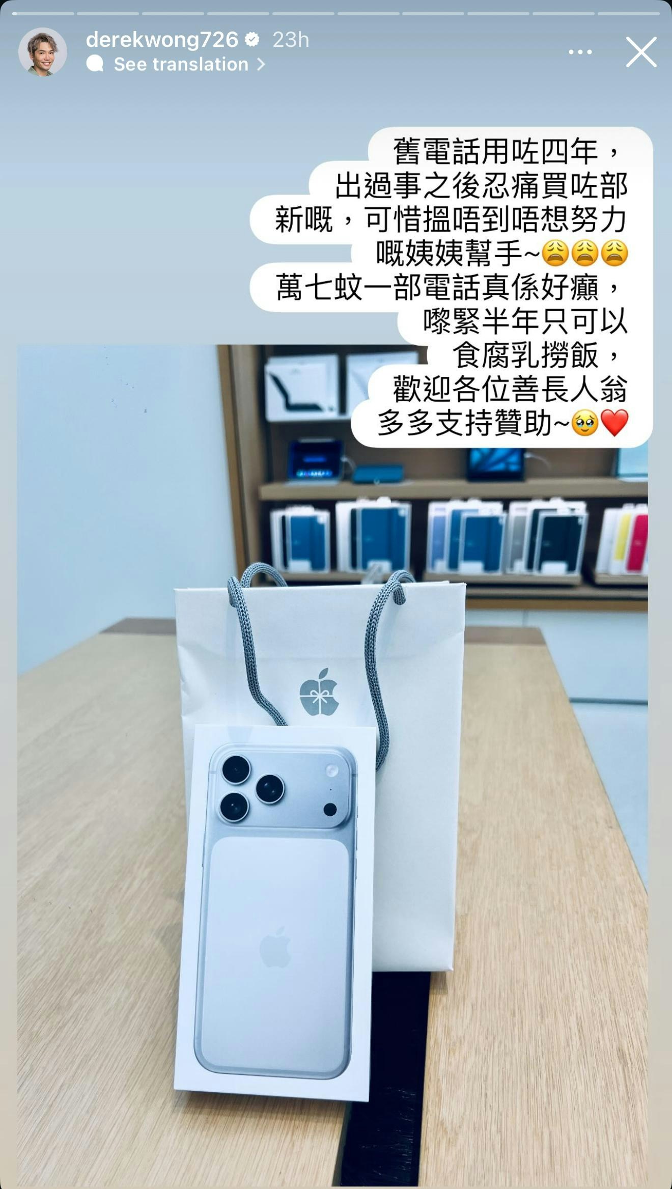黃建東日前於Instagram出Post表示,買最新款iPhone 17買到窮。他曬出新電話照片,指使了一萬7000蚊買電話「好癲」,半年要食腐乳撈飯,更希望「善長人翁」幫手。黃建東發文指:「舊電話用咗四年,出過事之後忍痛買咗部新嘅,可惜搵唔到唔想努力嘅姨姨幫手~萬七蚊一部電話真係好癲,嚟緊半年只可以食腐乳撈飯,歡迎各位善長人翁多多支持贊助~」。