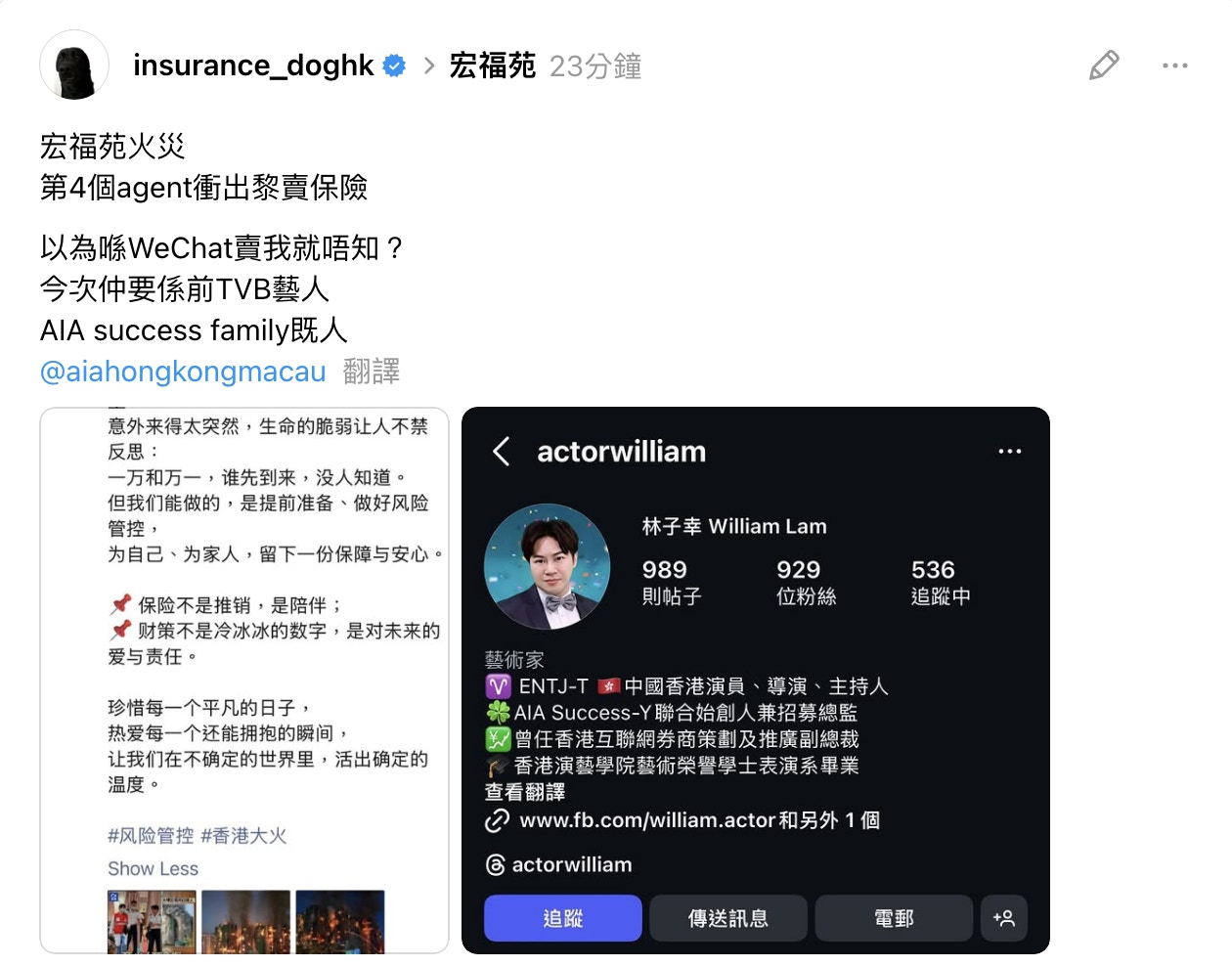 有KOL在社交平台表示,發現一位TVB特約演員在這個時候竟然sell保險,他指:「宏福苑火災第4個agent衝出黎賣保險 以為喺WeChat賣我就唔知? 今次仲要係前TVB藝人 AIA success family既人」。