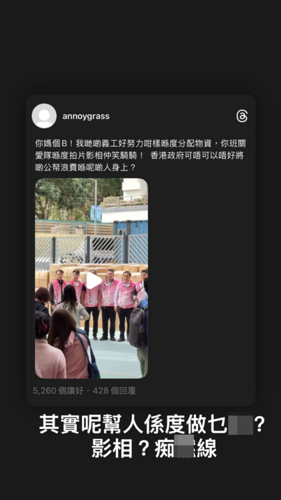 但是有網民發現有關愛隊成員在分發物資時,在場內一字排開合照,疑在這個時期「打卡」,更有指他們在場內繞了一圈就離開,完全不是出自真心幫忙。有現場的市民、義工及網民看到這個情況受不了,發文怒轟關愛隊的行為。而歌手吳林峰亦在社交平台發火:「痴X線,未講關愛隊,根本同幸災樂禍冇分別,佢地個腦係裝乜X!」