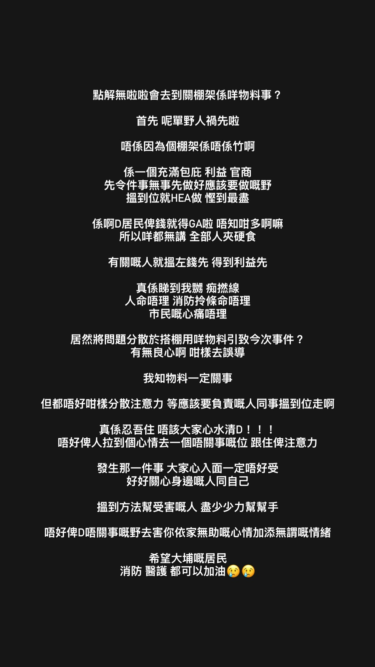 繼狠批關愛隊的行為之後,吳林峰更連出數個限時動態,繼續發洩心中的怒火。當中一篇疑似回應政務司司長陳國基昨日(27日)就災情接受傳媒訪問時發表的一番話,陳國基師長表示發展局正與業界會面,商討以更具耐燃性的金屬棚架全面取代傳統的竹棚。吳林峰因此而炮轟︰「點解無啦啦會去到關棚架係咩物料事?首先呢單嘢人禍先啦,唔係因為個棚架係唔係竹啊,係一個充滿包庇、利益……先令件事無事先做好應該要做嘅野,搵到位就HEA做,慳到最盡!D居民俾錢就得GA啦,唔知咁多啊嘛!所以咩都無講,全部人夾硬食,有關嘅人就搵咗錢先,得到利益先,真係睇到我嬲,痴X線!」