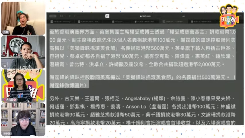 主持之一的曾志豪說:「唔講,但都會問你有冇捐錢吖嘛?」兆尊續說:「每個人有自己睇法,我屋企教我做咗善事唔使講俾人聽,自己心安理得就得。講你聽嘅原因,係我依家搵緊食,我話俾你聽因為我費事俾人插,第一;其他點解有啲人捐錢會喺自己慈善基金講出嚟,嗰啲真係捐錢,私人攞出嚟未必係(會講)捐錢,因為捐錢例如每年《歡樂滿東華》、《仁濟》......點解咁多人衝出嚟捐錢,啲大有錢佬,因為啲錢可以抵消佢哋俾嘅稅,藝人都一樣,例如捐100萬,咁稅可以扣返100萬,所以好多藝人衝出嚟我捐咗呢個錢,咁稅咪俾少咗囉。」