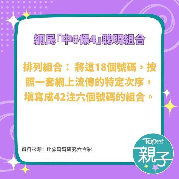 「中6保4」通常指選定一組號碼(例如18個心水號碼),透過特殊組合方式,將這18個號碼排成一系列預設組合(如42注),只要六合彩結果有4個號碼落在這18個心水內,系統會有至少2注有3個中獎號碼。以一注$10計算,即成本為$420,若只購買$5半注,只要$210即可刀仔鋸大樹,​與傳統全餐複式投注相比,這種玩法大幅節省下注成本。