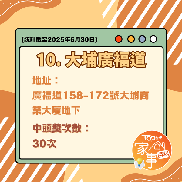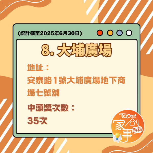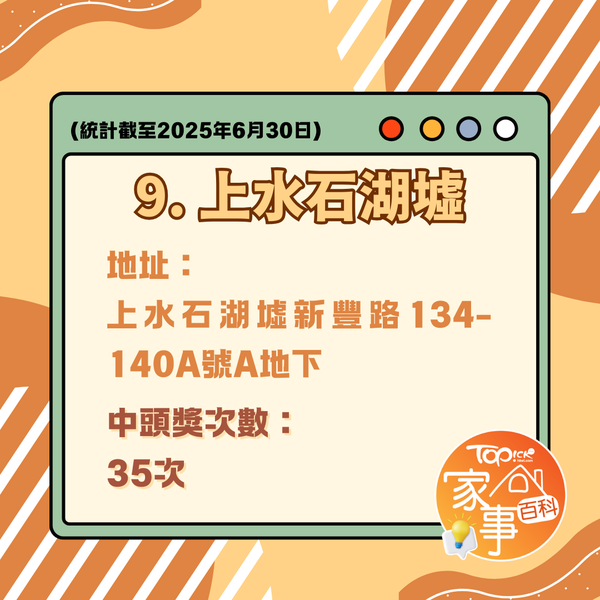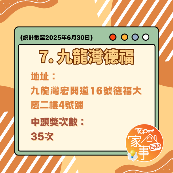 • 並列第7:上水石湖墟投注站在上半年賣出兩張頭獎彩票,使其總數增至35張,與九龍灣德福及大埔廣場投注站看齊。