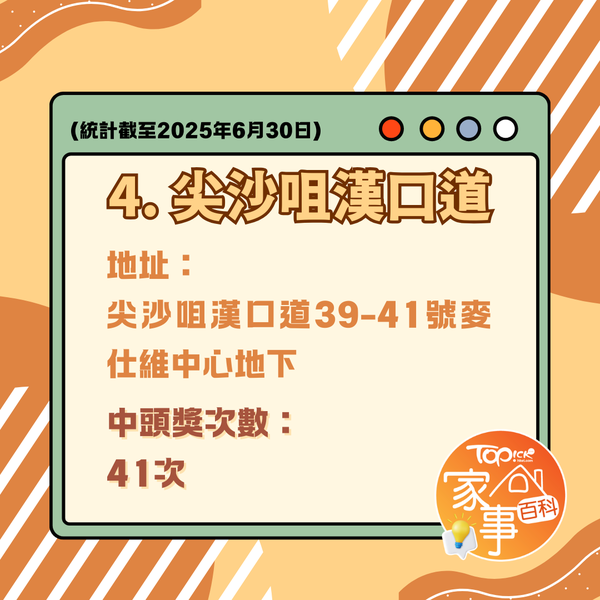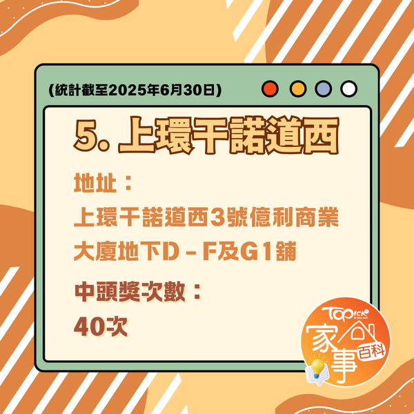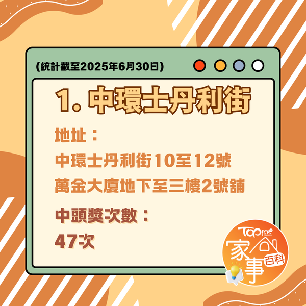 • 第1位:中環士丹利街投注站,累計售出47張頭獎彩票,繼續保持領先。