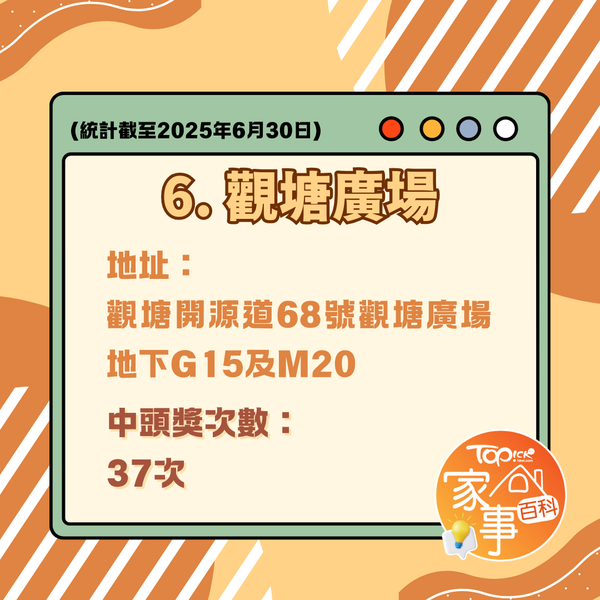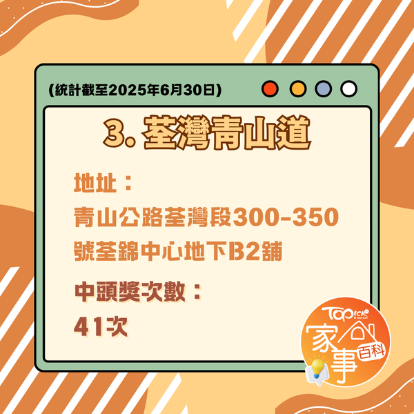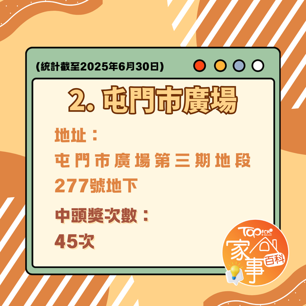 • 第2位:屯門市廣場投注站,今年上半年再添一張頭獎彩票後,累計已達45張,與榜首僅差兩張,威脅其「最旺」地位。