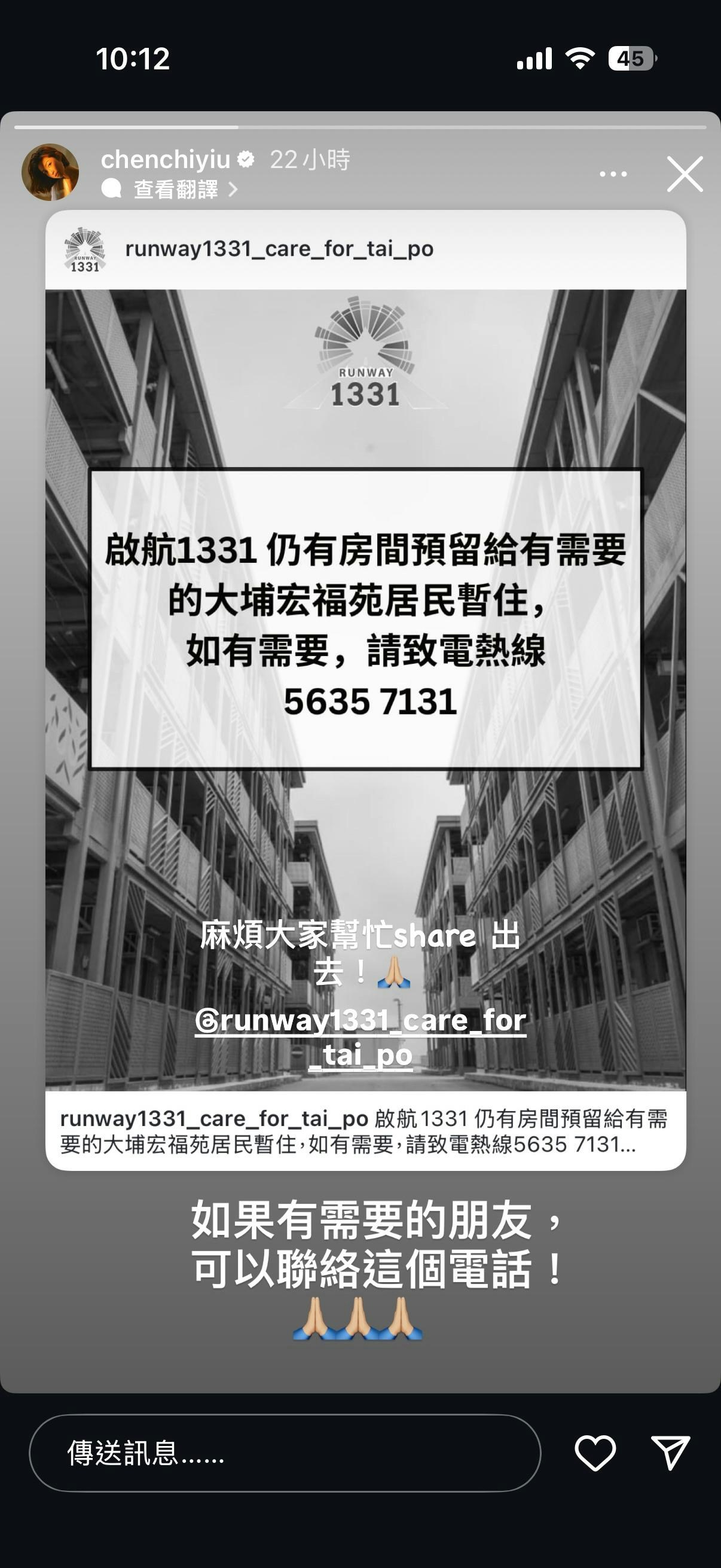 陳自瑤昨日於她的IG story轉發了哪個地方仍有住屋可以安排給受影響災民的信息,貼文寫道:「啟航1331仍有房間預留給有需要的大埔宏福苑居民暫住,如有需要,請致電熱線 5635 7131」,通知大家並廣傳給有需要的人知道,希望有需要的災民能盡快獲得安排住宿。
