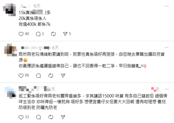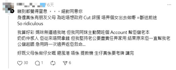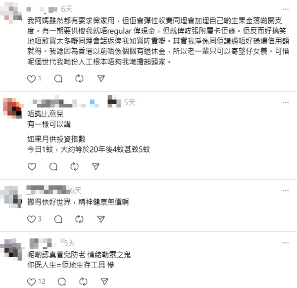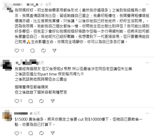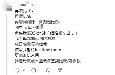 「搬出去唔洗俾伙食養我哋?」、「你係咪以為俾得幾個錢拖捨俾我地?」、「咁姐係逼我地冇人理做乞丐靠政府」。不過,這令樓主更加堅定搬出去住的想法,「呢啲說話係唔會令我想俾多啲錢,只會覺得更加堅定有能力就搬出去住」。