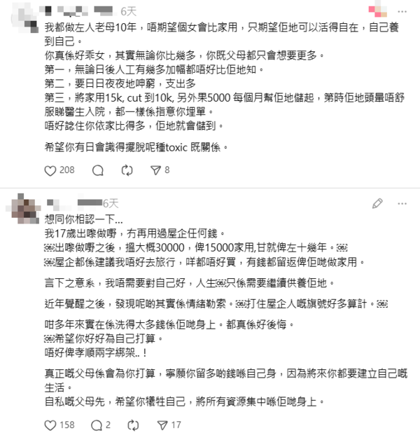 樓主慨嘆羨慕一些人的父母對子女沒有經濟回報的期望,並已計劃好自己的退休生活和健康保障;她憶述自己由18歲起便沒有向家裡要錢,學費靠政府,還會做家教兼職,每月給家裡2,000元;如今畢業工作月薪3.5萬元,每月貼補家用1.5萬元,惟父母犹嫌不足。