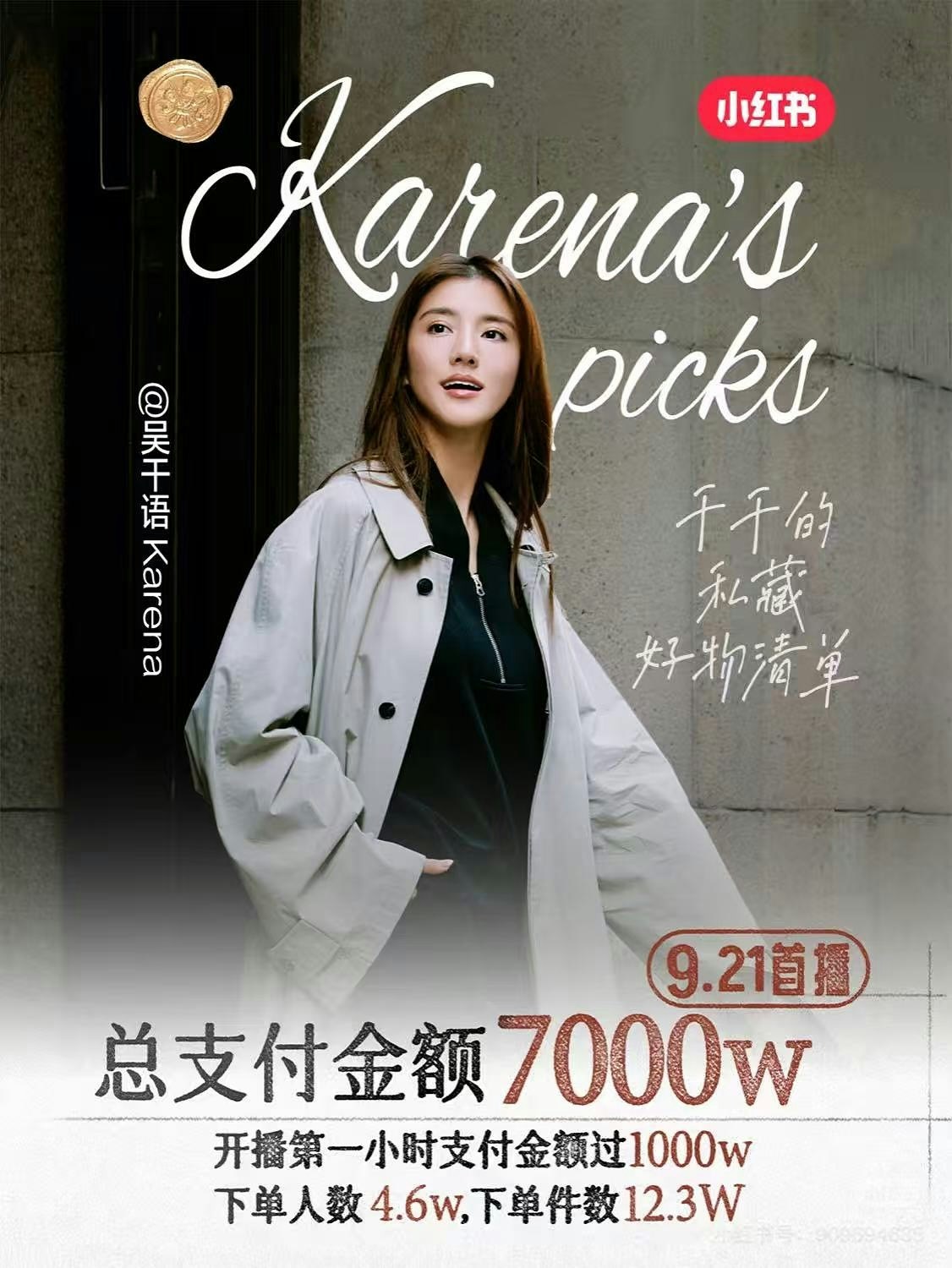 首場直播帶貨創下GMV(商品成交總額)高達7,000萬人民幣(約7,711萬港元)的驚人紀錄。(小紅書圖片)
