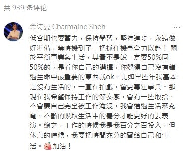 結果佘詩曼真的回覆了該名粉絲,且更是即日便回覆了,真是好驚喜。佘詩曼留言寫道:「低谷期也要蓄力,保持學習,堅持進步,永遠做好準備,等時機到了一把抓住機會全力以赴! 關於平衡事業與生活,其實不是說一定要50%同50%的,是看你自己的選擇,你覺得自己沒有錯過生命中最重要的東西就ok。比如早些年我基本是沒有生活的,一直在拍戲,會更專注事業。那現在我希望保持工作的節奏感,會有一些取捨,不會讓自己完全被工作淹沒,我會通過生活來充電,不斷的吸取生活中的養分才能更好的去表演。總之,工作的時候我是我百分之百投入,但休息的時候,我要把時間充分的留給自己和生活。加油!」非常認真地與粉絲分享,她的真誠獲得1.7萬個讚。