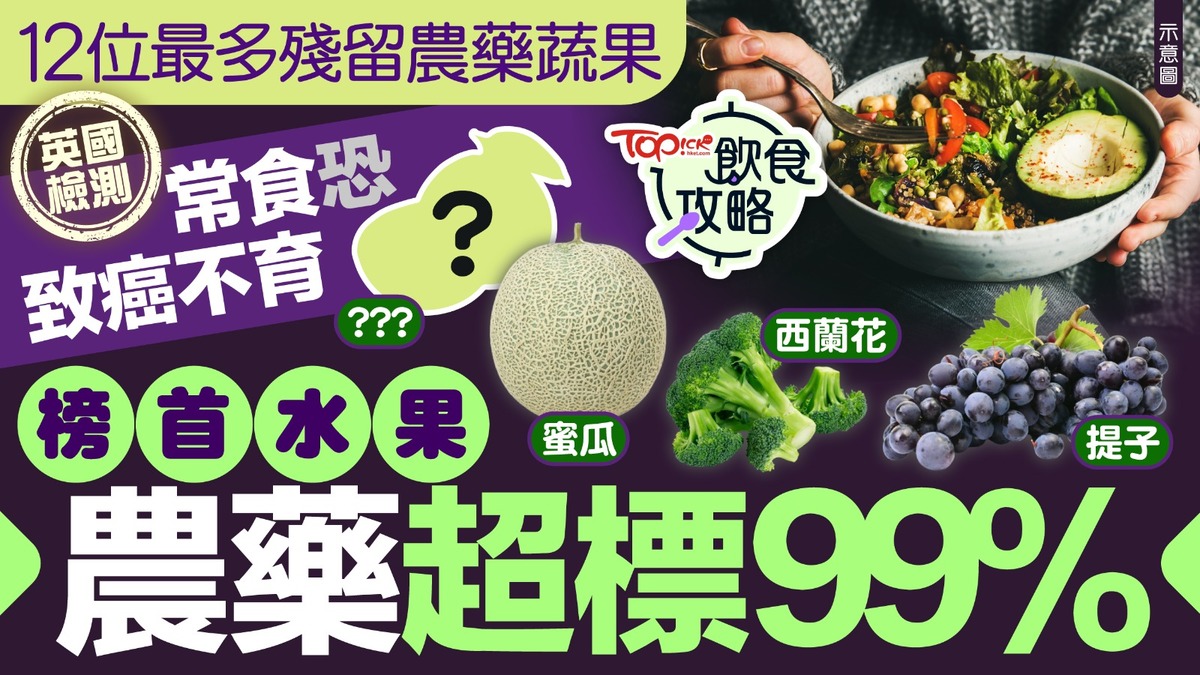 蔬果/農藥/癌症/不育|農藥無色無味,即使已仔細清洗,但仍然難以分辨是否乾淨。英國非牟利組織日前公布的最新報告指出,當地超市最常見的水果蔬菜中,有12種已成為農藥殘留最嚴重的「最毒蔬果」。其中農藥殘留最嚴重的水果樣本,更被驗出含高達99%多重農藥殘留,長期進食可能導致癌症或不育,情況令人堪憂。