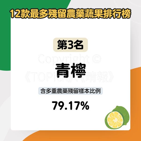 據英媒《Daily Mail》報道,英國非牟利組織「農藥行動網絡」(PAN UK)近日分析政府檢測數據後,列出農藥殘留最嚴重的12種蔬果,其中包括提子及青檸等。