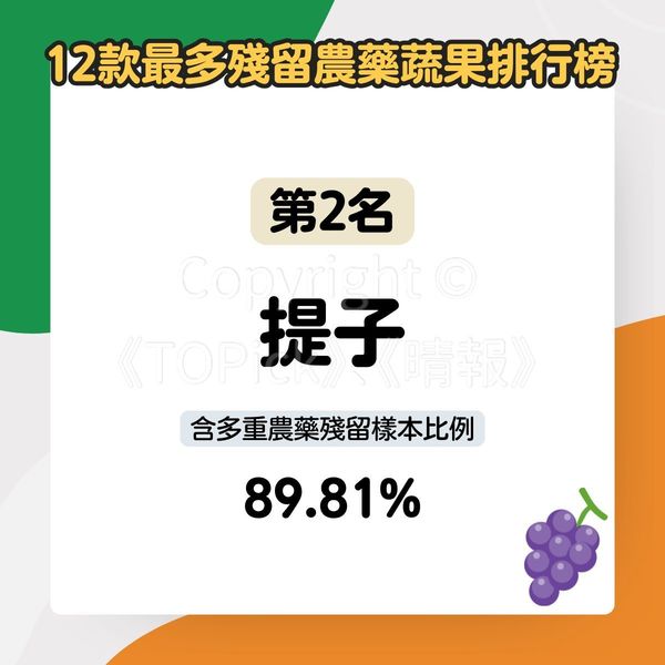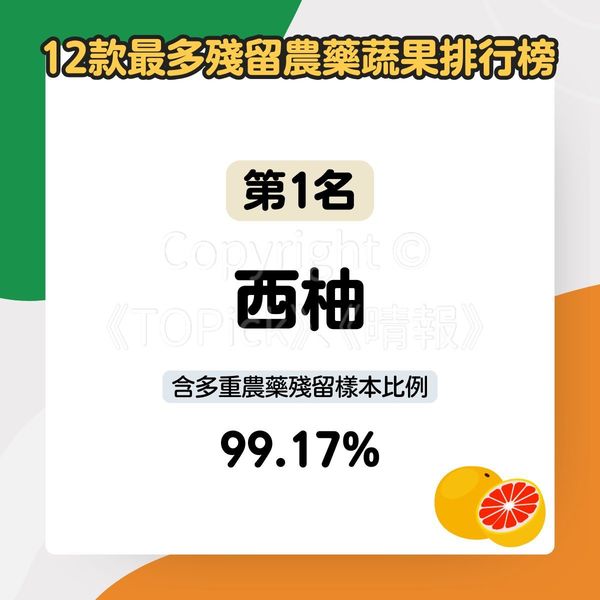 報告分析指出,排名第一的西柚樣本中,121個樣本有120個含多重農藥殘留,風險比例最高;提子(108個樣本中的97個)和青檸(24個樣本中的19個)的殘留比例亦相當高。更嚴重的是,一個從土耳其進口的提子樣本中,竟驗出16種不同農藥殘留。