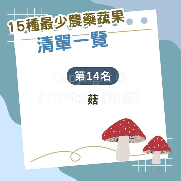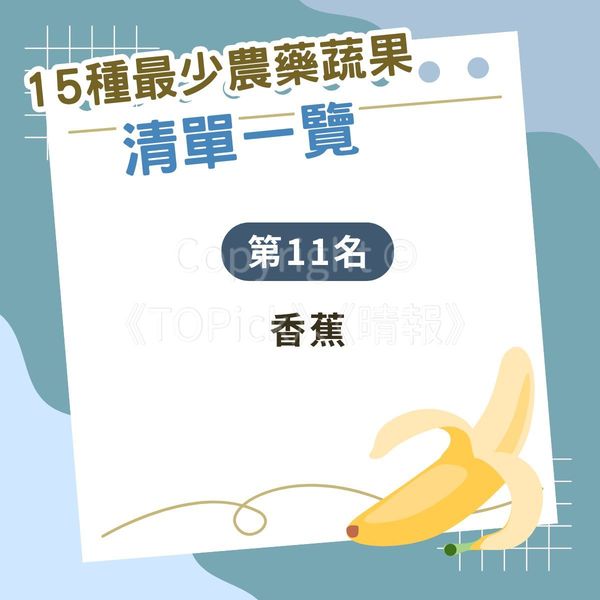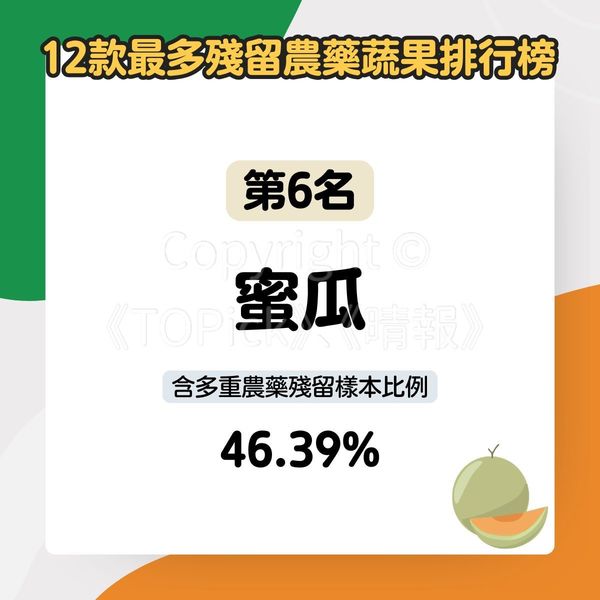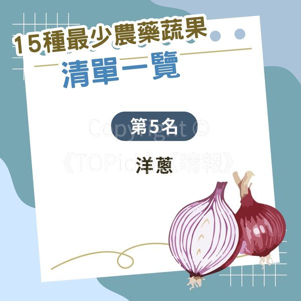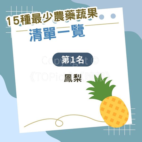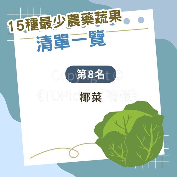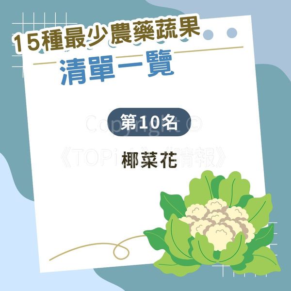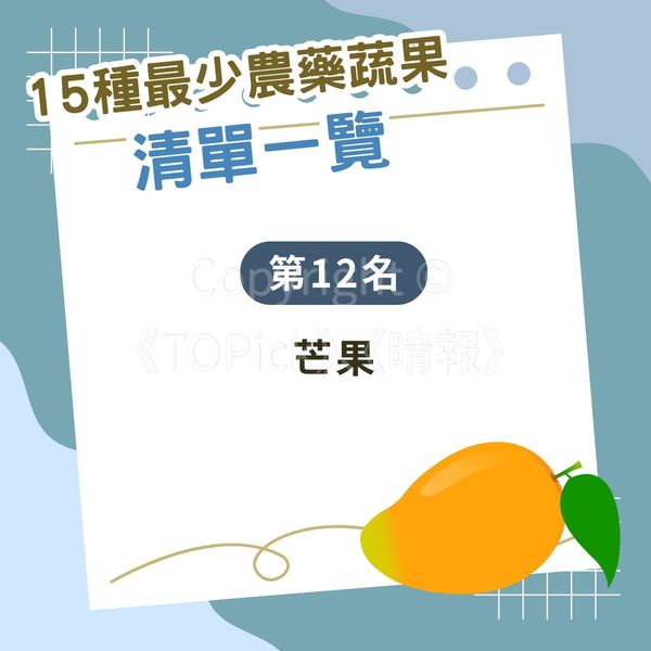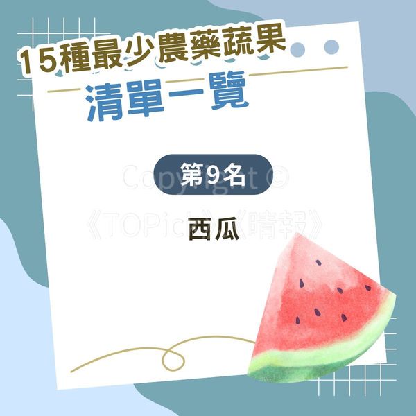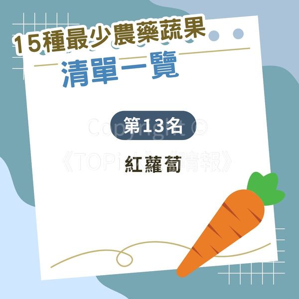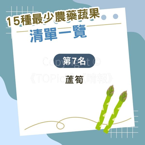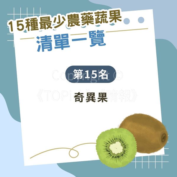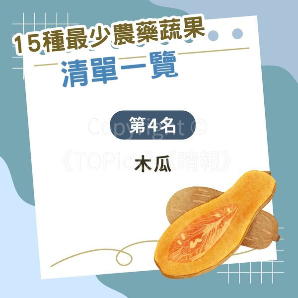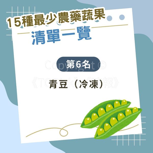 除了最多農藥蔬果,組織亦列出以下15種農藥含量較少、毒性較低的蔬果,其中6成幾乎無農藥殘留,只有16%含有2種或以上農藥的殘留、前6位蔬果中,沒有一款樣本含3種以上農藥殘留。