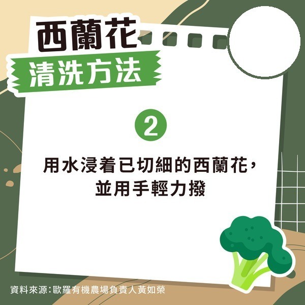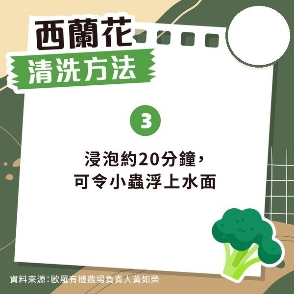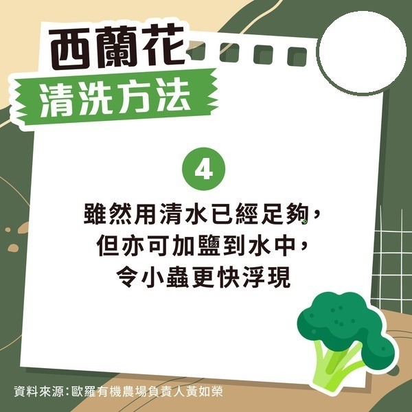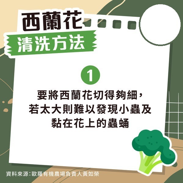本港歐羅有機農場負責人黃如榮接受本報訪問時,也曾指出,蔬菜出現幼蟲是十分普遍,番茄、苦瓜、芥菜、白菜、椰菜花及西蘭花為最常出現菜蟲的蔬菜。其中西蘭花「窿窿罅罅」較多,是眾多蔬菜中最易有蟲,因此他建議清洗時把葉摘開後,將西蘭花切細,並用清水沖洗浸泡長時間,「過多兩轉水」,確保清洗蔬菜每一處才進食。