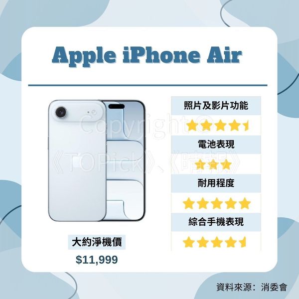 是次測試樣本中,「Apple iPhone Air」僅支援eSIM,完全取消實體SIM卡槽。現有使用傳統實體SIM卡的用戶若選用此型號,須向網絡供應商申請轉換至eSIM,才能連接網絡。