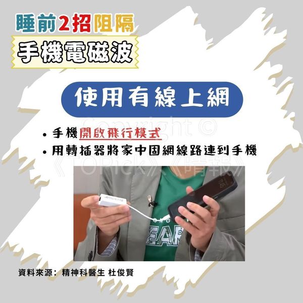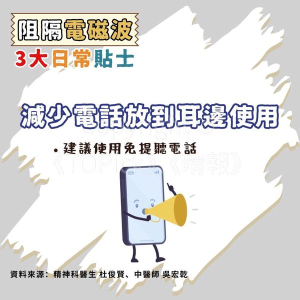 很多人習慣睡眠時將電話放在床頭充電,其實這個習慣很有可能會增加人體吸收電磁波的機率。故此,他建議2招阻隔手機電磁波,以及綜合3招日常預防: