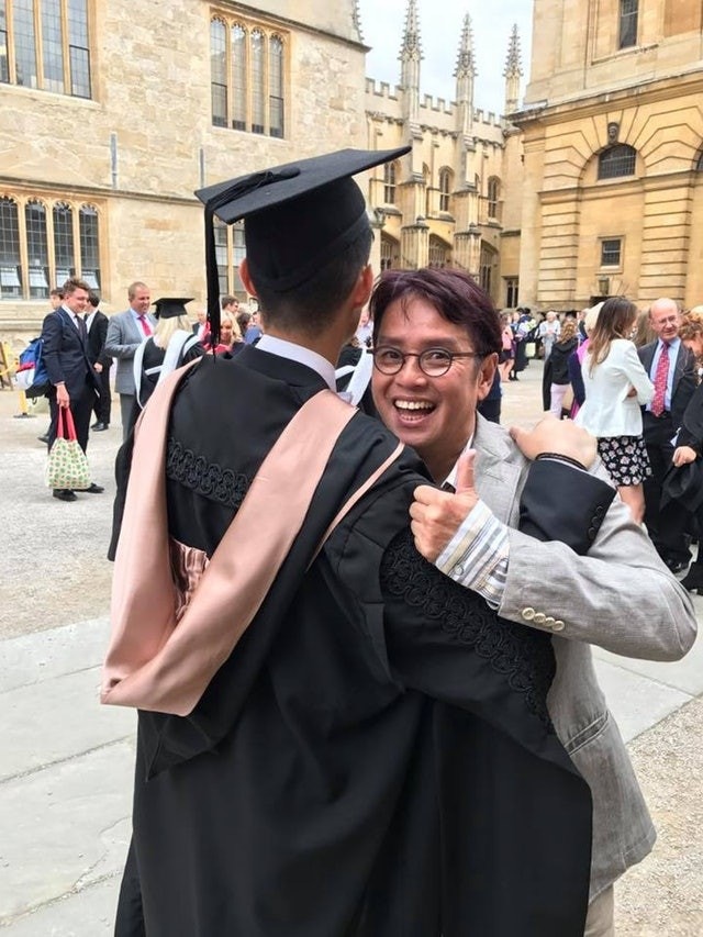 仔仔畢業時,譚詠麟親自飛英國觀禮。(譚詠麟微博)