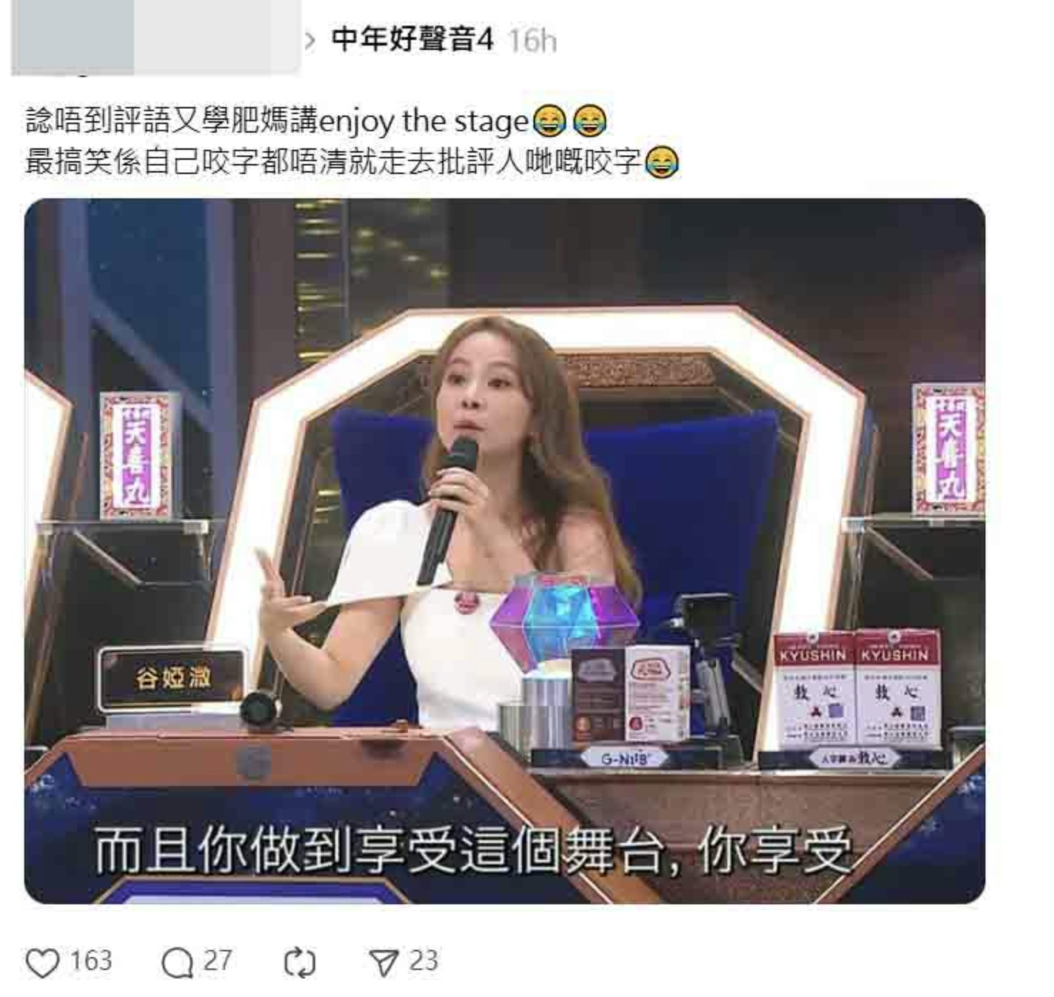 TVB歌唱選秀節目《中年好聲音4》近日熱播中,而「TVB劇集歌女王」谷婭溦也加入成為今屆常駐評審,不過有網民就質疑她未夠班做評審,指她點評參賽者「咬字 ...