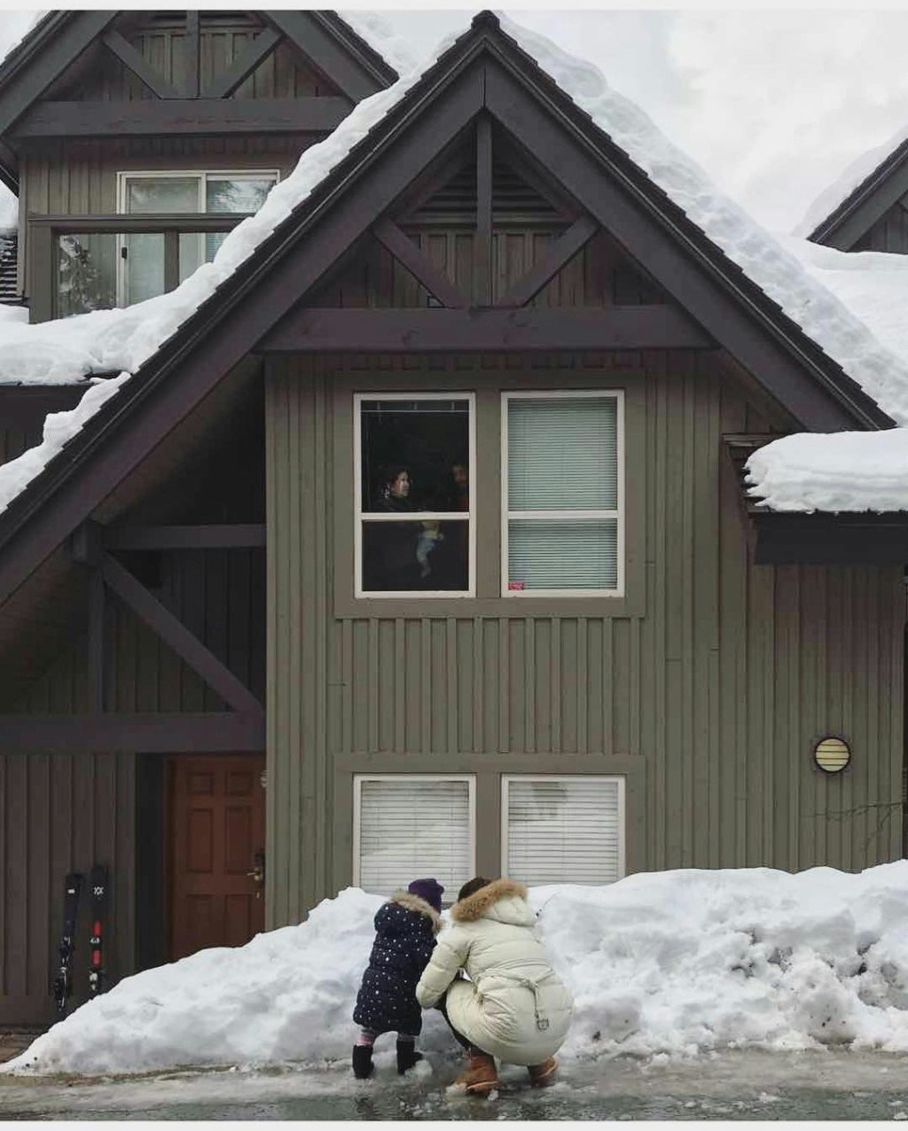 鍾嘉欣在獨立屋外與子女玩雪。(IG@chungkayanlinda)