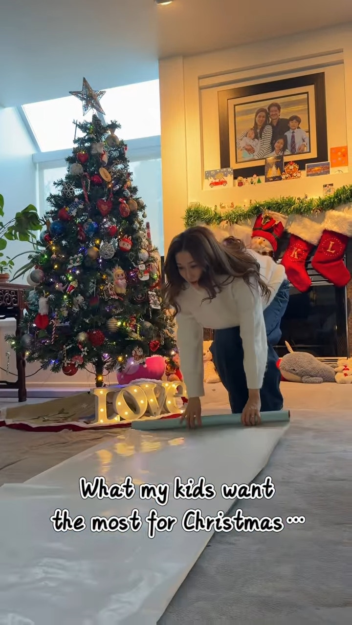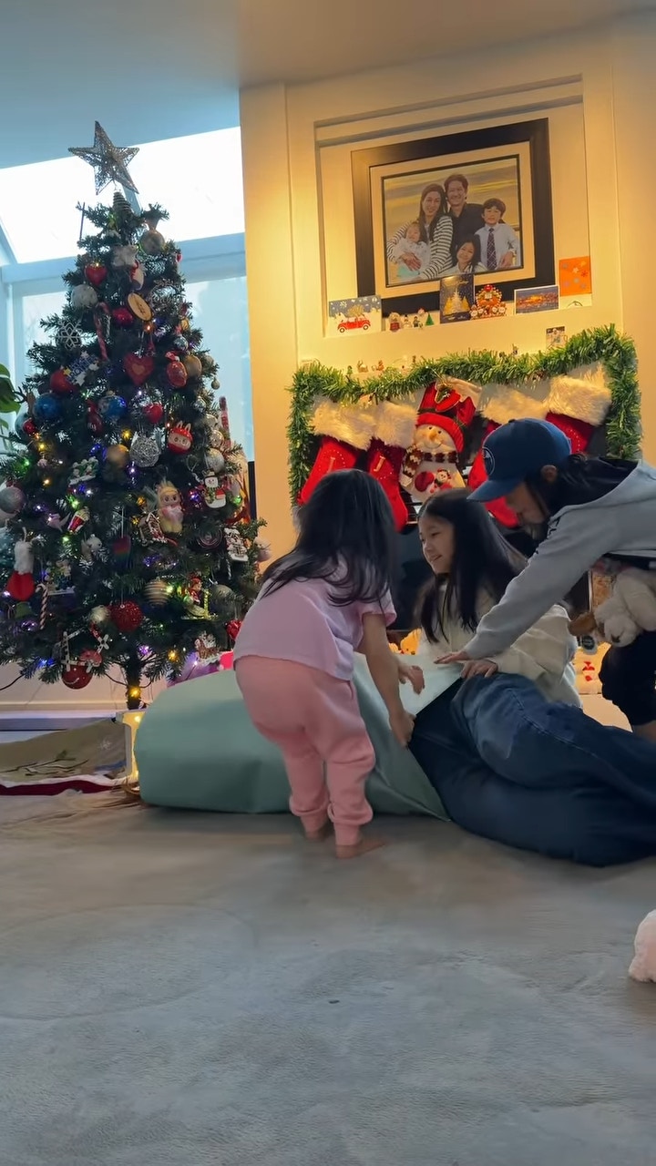 片中所見,鍾嘉欣將自己包成禮物,讓3名子女「拆禮物」,她又炮製聖誕大餐,並與老公齊齊玩情侶挑戰,可見一家人感情極好!而鍾嘉欣的豪宅亦成為焦點,可見獨立屋樓底極高,裝修簡約,客廳空間闊落,角落擺放了一棵聖誕樹,還鋪上了地氈,而在另一層空間就設有壁爐,上方掛了全家福,相當溫馨,至於廚房亦空間感十足,焗爐及廚具設備俱全。