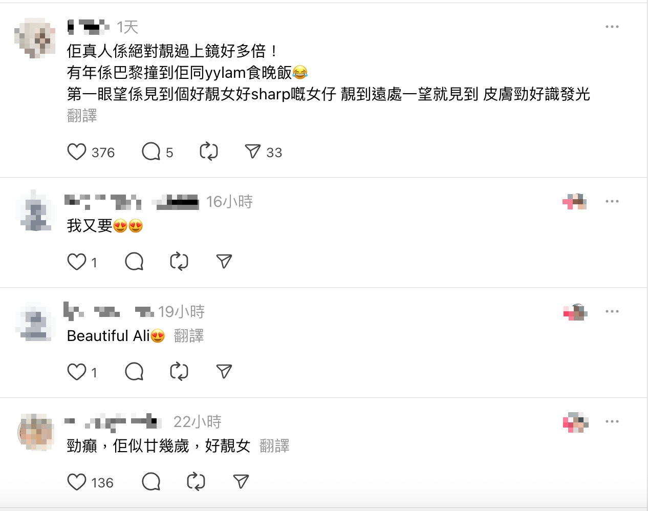 最近,有網民在機場巧遇李佳芯,該網民在社交平台出post說:「搭飛機見到女神,落機突然見到佢行到我隔離,即刻鼓起勇氣問可唔可以影張相,跟住一邊行一邊快影咗一張,Ali真係好靚🥹真人好高皮膚好好。」對於李佳芯的皮膚狀態,有其他網民留言表示認同:「佢真人係絕對靚過上鏡好多倍!有年係巴黎撞到佢同yylam食晚飯😂第一眼望係見到個好靚女好sharp嘅女仔,靚到遠處一望就見到,皮膚勁好識發光。」