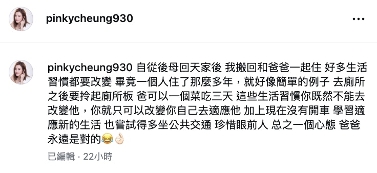 張文慈在Instagram分享搭地鐵的照片,她戴上口罩,心情相當不錯。張文慈透露自後母逝世後,搬回家照顧爸爸,要遷就爸爸的生活習慣,她說:「自從後母回天家後 我搬回和爸爸一起住 好多生活習慣都要改變 畢竟一個人住了那麼多年,就好像簡單的例子 去廁所之後要拎起廁所板 爸可以一個菜吃三天」。