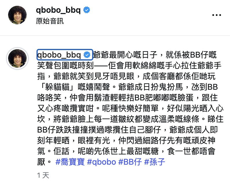 網絡劇《守誠者》由陳小春、李治廷主演,今年7月已在網絡平台上播出,喬寶寶有份演出,有消息指獲安排於本月16日在重回TVB大熒幕播放,喬寶寶亦有在社交平台轉發宣傳片段。喬寶寶除了不時接戲拍,也重視家庭生活。近日他曬出攬住三個孫的片段,一臉幸福,喬寶寶發文:「爺爺最開心嘅日子,就係被BB仔嘅笑聲包圍嘅時刻——佢會用軟綿綿嘅手心拉住爺爺手指,爺爺就笑到見牙唔見眼,成個客廳都係佢哋玩『躲貓貓』嘅嬉鬧聲。爺爺成日扮鬼扮馬,氹到BB咯咯笑,仲會用鬍渣輕輕拮BB肥嘟嘟嘅臉蛋,跟住又心疼噉攬實咁。呢種快樂好簡單,好似陽光晒入心坎,將爺爺臉上每一道皺紋都變成溫柔嘅線條。睇住BB仔跌跌撞撞撲過嚟攬住自己腳仔,爺爺成個人即刻年輕晒,眼裡有光,仲閃過細路仔先有嘅頑皮神氣。佢話,呢啲先係世上最甜嘅糖,食一世都唔會厭」